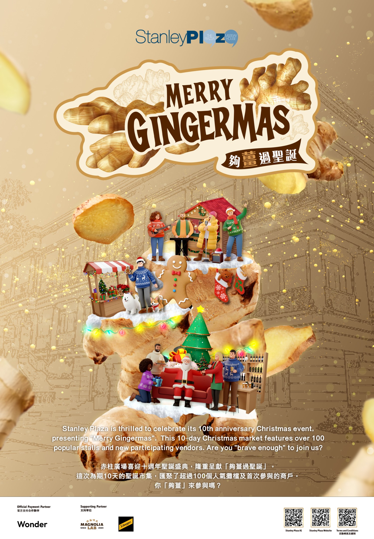 這個冬天,赤柱廣場迎來十周年聖誕盛典,特別以「夠薑過聖誕」為主題,打造一場既暖身又暖心的節慶體驗!「薑」不僅是驅寒養生的好食材,更是聖誕薑餅人的靈魂所在;而在廣東話中,「夠薑」更代表一份敢於嘗試的膽量。