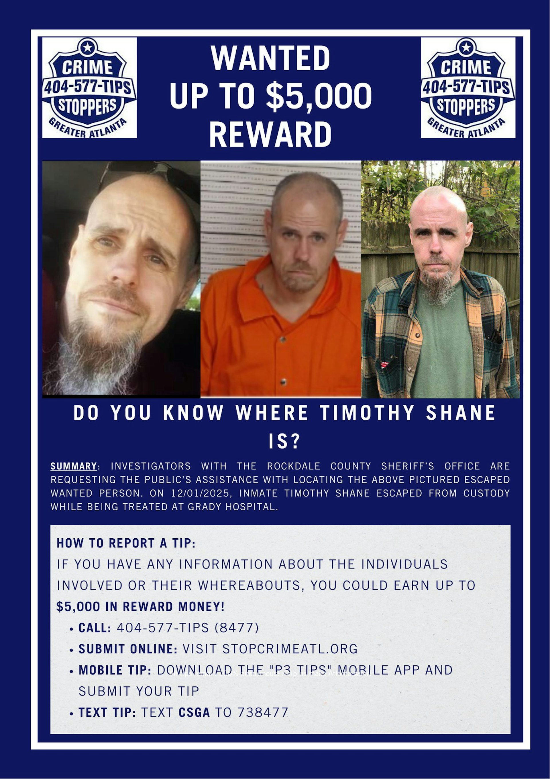 據美媒報道,逃跑的囚犯名叫謝恩,他在11月30日晚上因自殺未遂後接受體檢,從拘留所被送往亞特蘭大的格雷迪醫院,隨後在翌日凌晨約1時20分逃脫。