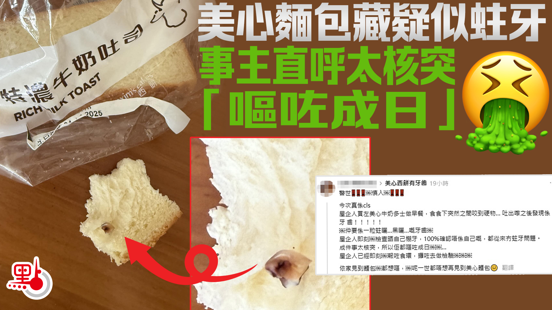 該名網民在社交平台threads發文指,家人買了美心西餅的「特濃牛奶吐司」做早餐,進食期間突然咬到硬物,「吐出嚟之後發現係牙齒,仲要係一粒蛀曬…黑曬…嘅牙齒」。事主稱,家人即時檢查自身牙齒,確認該牙並非家人所有,「屋企人即刻檢查晒自己棚牙,100%確認唔係自己嘅,都從來冇蛀牙問題。」
