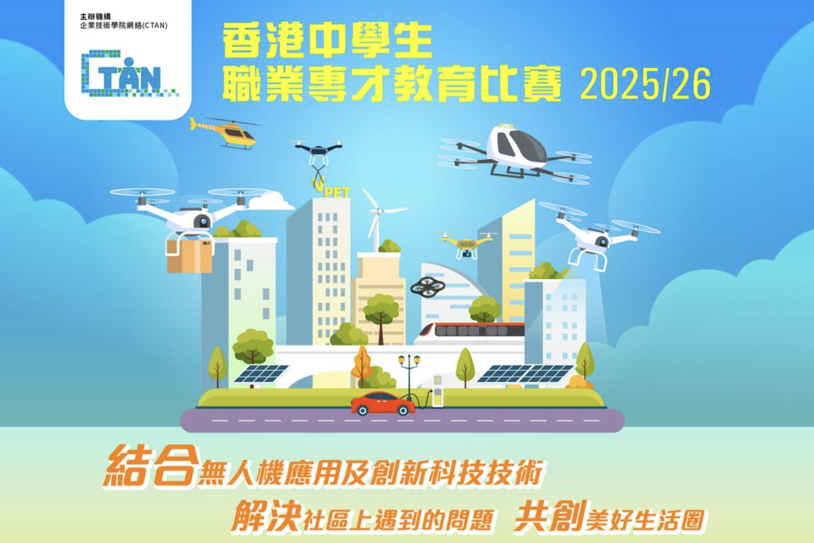 「企業技術學院網絡」(Corporate Tech Academy Network,簡稱CTAN)舉辦的「香港中學生職業專才教育比賽2025/26」,今年以「無人機應用×創科科技」為主題,鼓勵中學生發揮創意,探索如何結合無人機應用及創新科技技術,解決生活中的各種問題,以提升他們的創造力,發掘他們在創新科技方面的潛能。