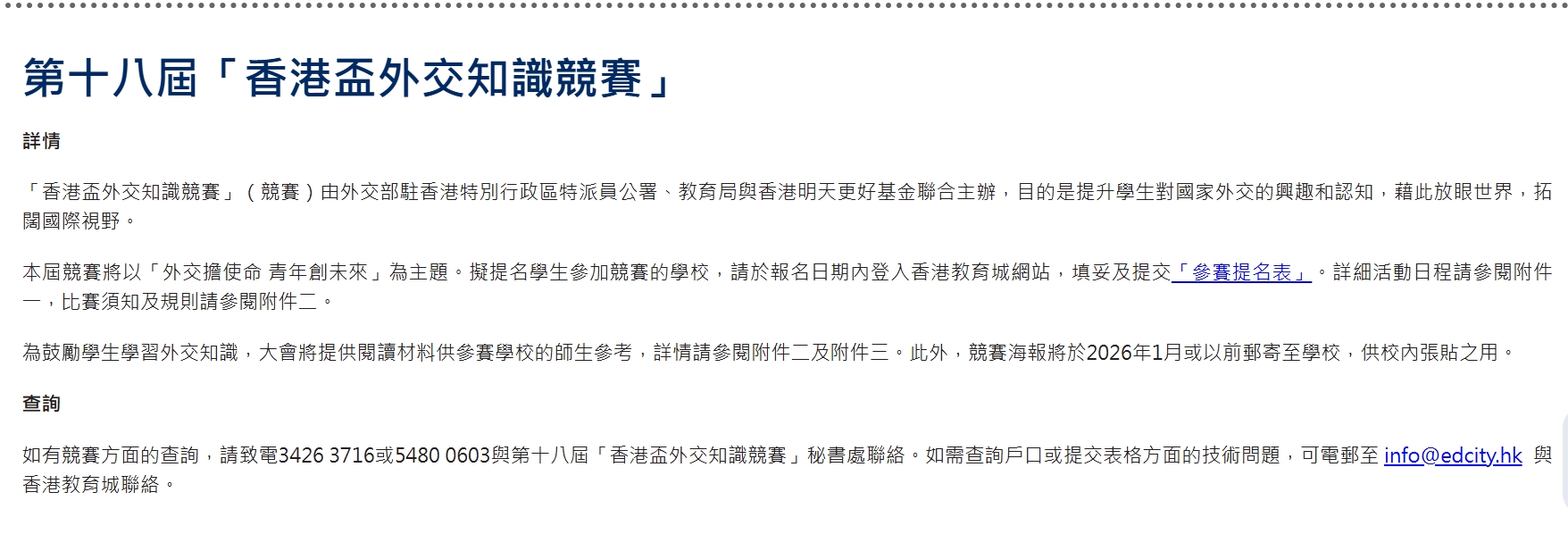 由外交部駐香港特別行政區特派員公署、教育局與香港明天更好基金聯合主辦的「香港盃外交知識競賽」,目的是提升學生對國家外交的興趣和認知,藉此放眼世界,拓闊國際視野;了解香港回歸以來發展歷程和前景,增加對落實基本法、香港國安法、《維護國家安全條例》重要性的認識,促進學生深刻體會香港「背靠祖國、聯通世界」的獨特優勢和地位,思考香港如何發揮「橋樑」作用。