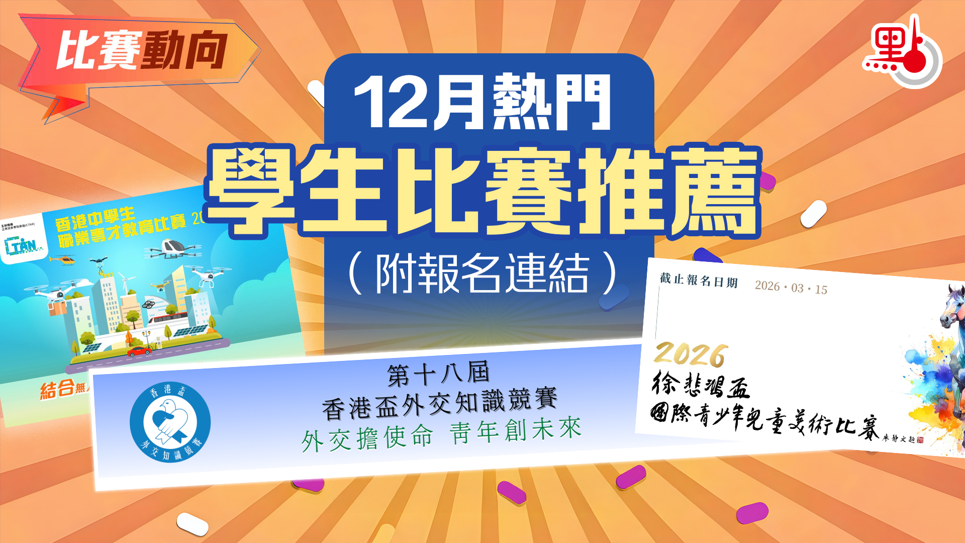 【點新聞報道】2025年漸進尾聲,「雙旦」——聖誕節與元旦假期就要到了,這個假期你打算怎麼過?點新聞整理了3大熱門學生比賽,涵蓋外交知識、無人機應用及AI繪畫,獎品豐厚,助你在享受假期的同時,把握每個展示自我的舞台!
