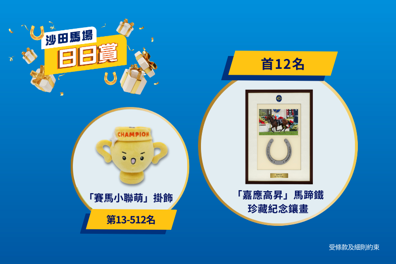 「沙田馬場日日賞」有獎問答遊戲,只需於下午4時15分身處沙田馬場範圍,即可參與!屆時在場人士打開「馬會投注三合一」應用程式登入投注戶口,於「馬上發現」進入活動頁面,首12名按指示最快提交正確答案的參加者,可獲指定「嘉應高昇」馬蹄鐵珍藏紀念鑲畫一幅!其後500名可獲指定「賽馬小聯萌」掛飾一隻。