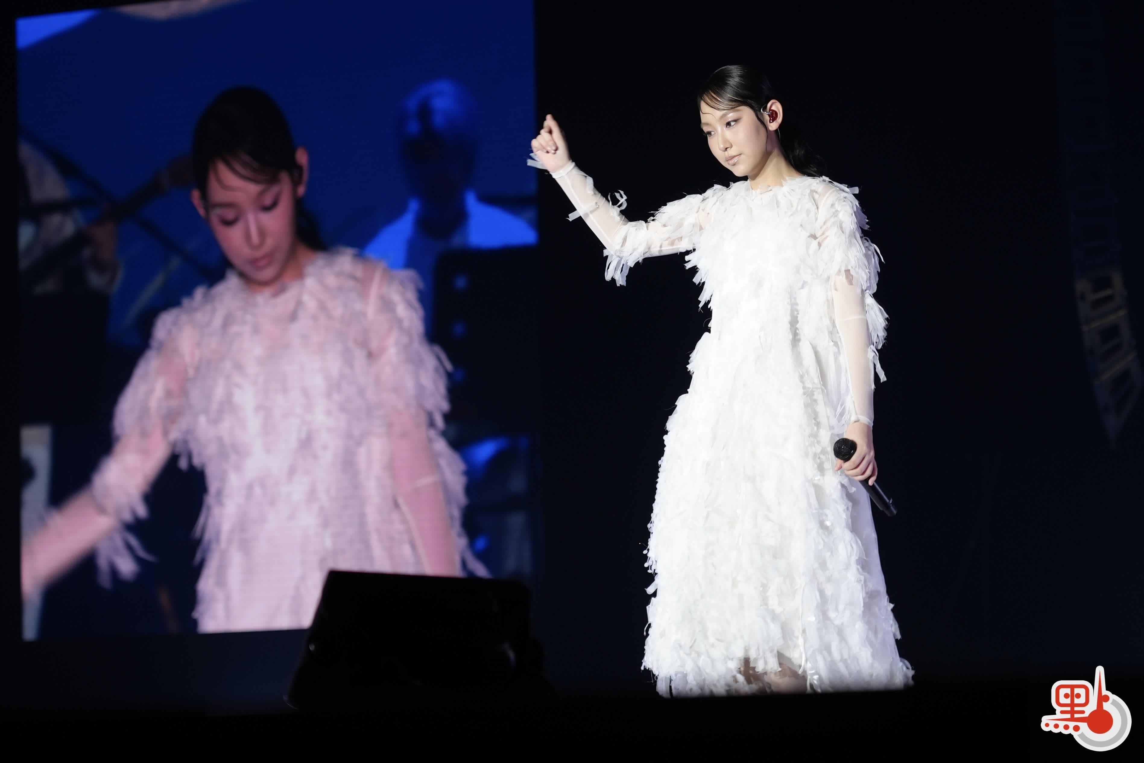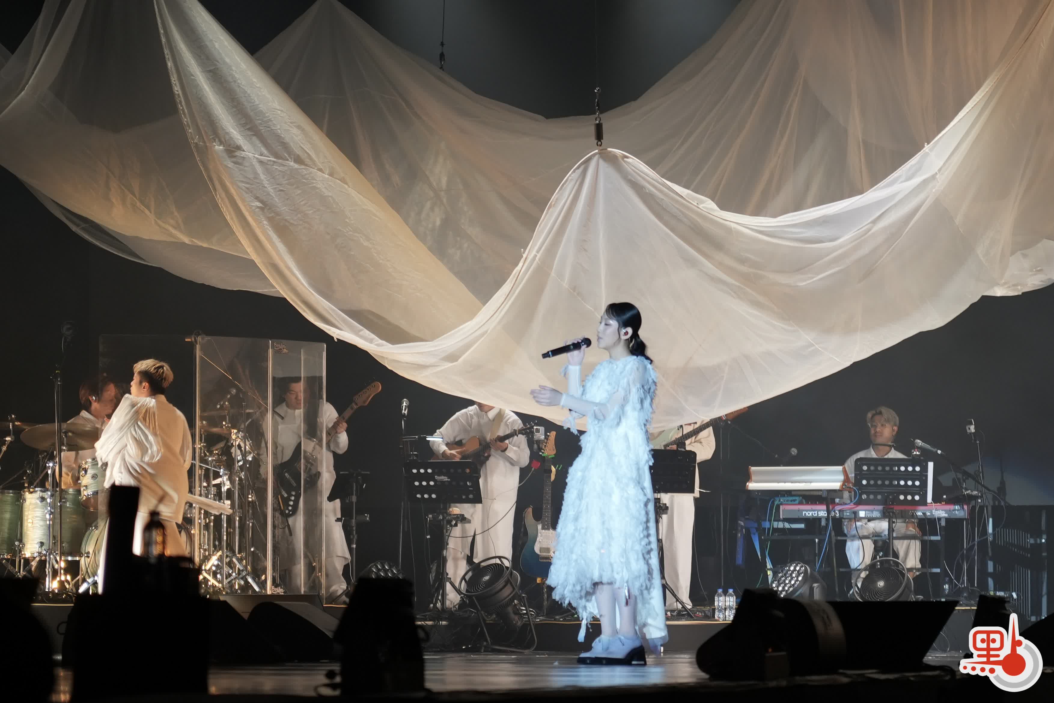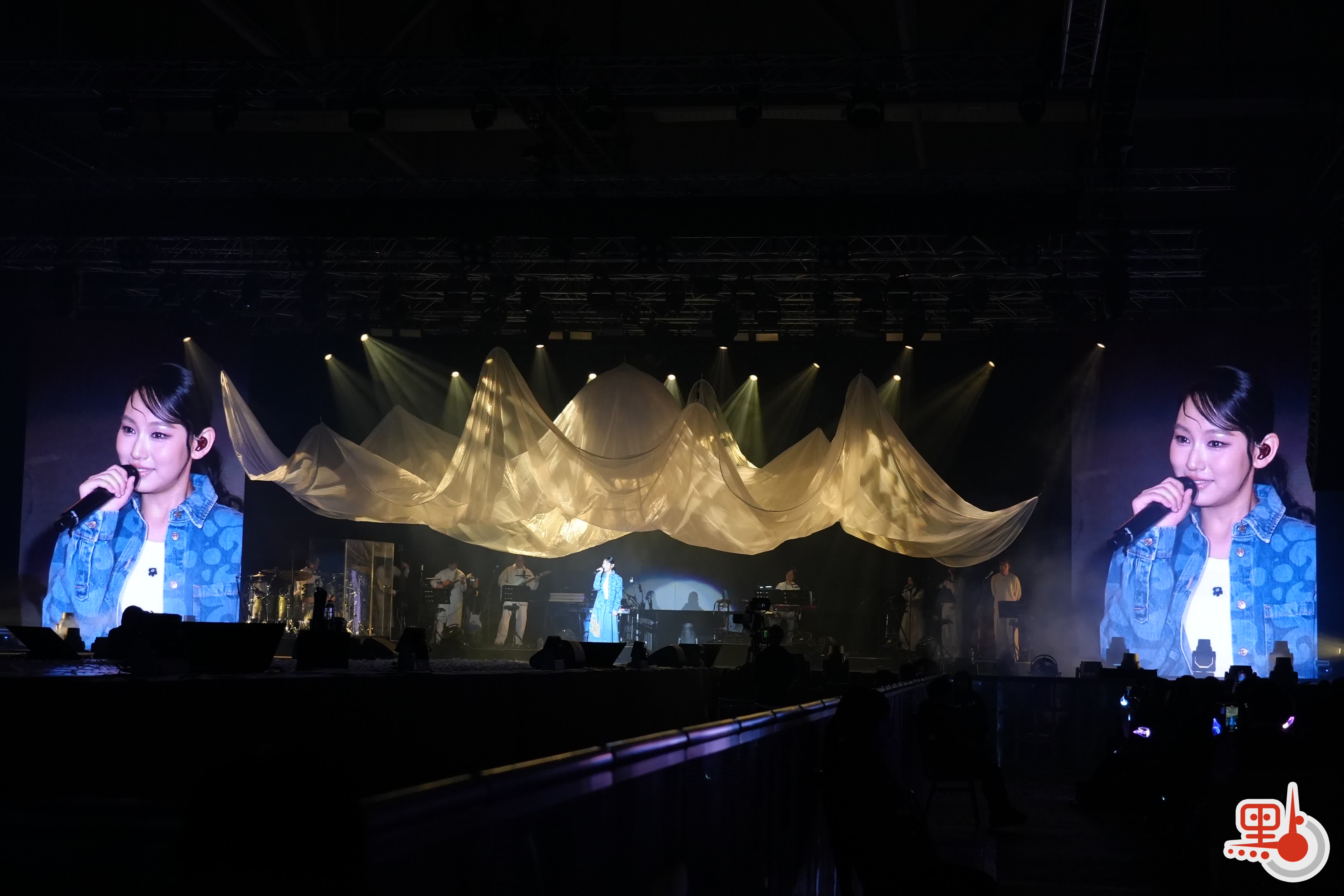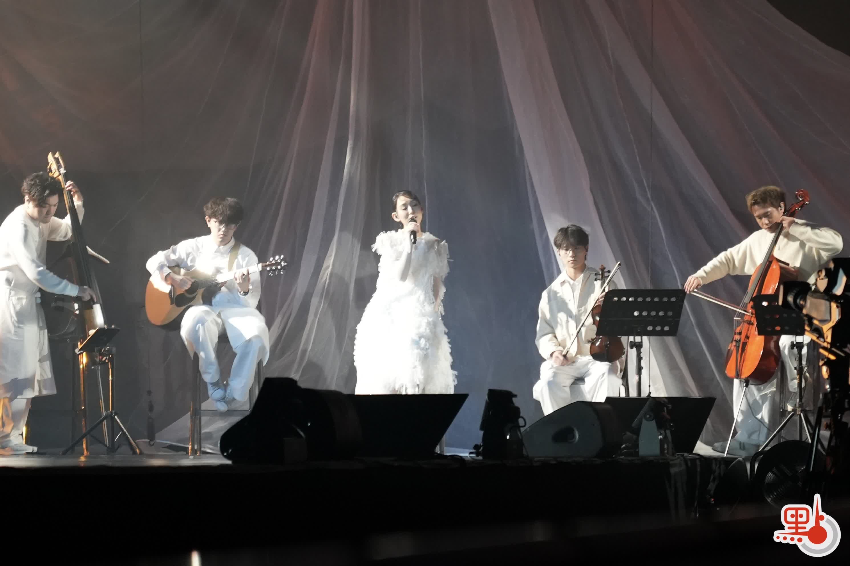 隨後,Gigi換上一身白色羽毛長裙現身舞台,身邊圍着樂隊演奏,自己則坐在高腳凳,輕聲演唱《夜闌人靜》、《我真的受傷了》及《後會無期》等情歌曲目,引得現場歌迷動容。