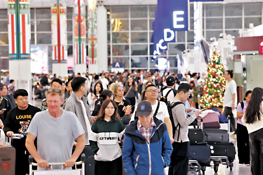 香港國際機場昨日迎來出入境人潮,其中離境大堂擠滿趁假期外遊的巿民,航空公司櫃枱前擠滿推着行李辦理登機手續的巿民,他們外遊目的地包括韓國、日本、越南及台灣地區,亦有巿民到內地度假。機場管理局預計聖誕及新年假期,每日最多約有1,200班航班升降,單日客流最高峰達20萬人次,機場停車場所有長期停車位昨日一度泊滿車。西九高鐵站亦人頭湧湧,香港旅遊業議會總幹事楊淑芬估計,聖誕假期約有1,500個旅行團離港,當中六成是往內地的高鐵團。
