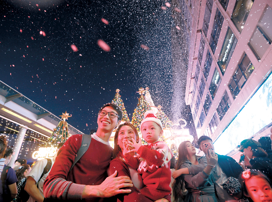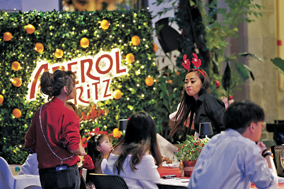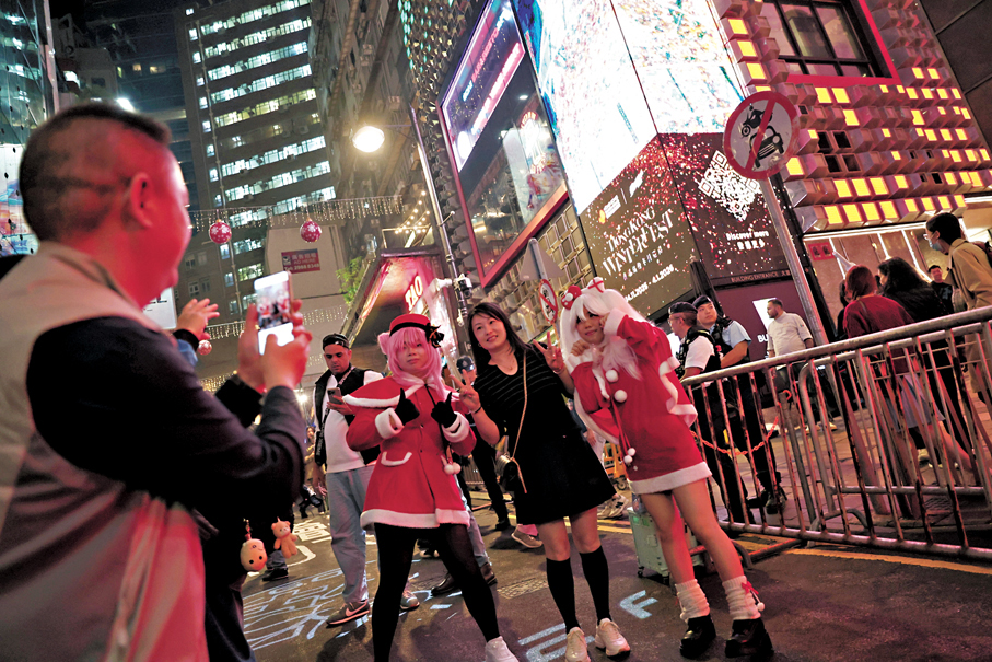 昨日平安夜香港各區人聲鼎沸,處處瀰漫濃烈的聖誕氣氛。中環、尖沙咀及西九龍等地已換上聖誕新裝,璀璨的聖誕燈飾及主題裝置吸引大量市民及旅客到臨打卡,不少人扶老攜幼外出歡度節日,也有內地旅客專程來港體驗富特色的聖誕氛圍。熱門「蒲點」蘭桂坊超過一半商戶提供優惠,包括折扣及贈送餐點等,預計旅客量增加會帶動人流。蘭桂坊協會總監張素媚表示,蘭桂坊整體訂座率達九成,人均消費按年升5%至10%,她說:「很多人打卡時會順道到蘭桂坊消遣,除了韓國或泰國的旅客團體外,多了很多願意消費的個人遊旅客,補充了本地人外遊的空缺。」