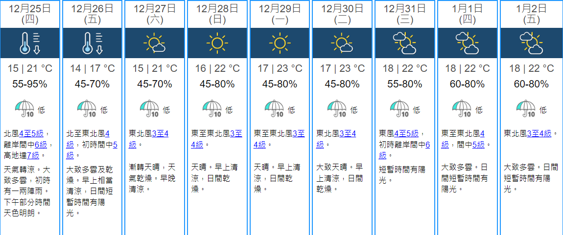 【點新聞報道】今日(25日)聖誕節,天文台表示,一股清勁至強風程度的東北季候風補充正影響廣東沿岸。同時,一道雲帶覆蓋該區。本港地區今日天氣預測大致多雲,初時有一兩陣雨。日間氣溫徘徊在19度左右。下午部分時間天色明朗。天氣轉涼。晚上市區氣溫下降至約15度,新界再低兩三度,吹和緩至清勁北風,離岸及高地間中吹強風。