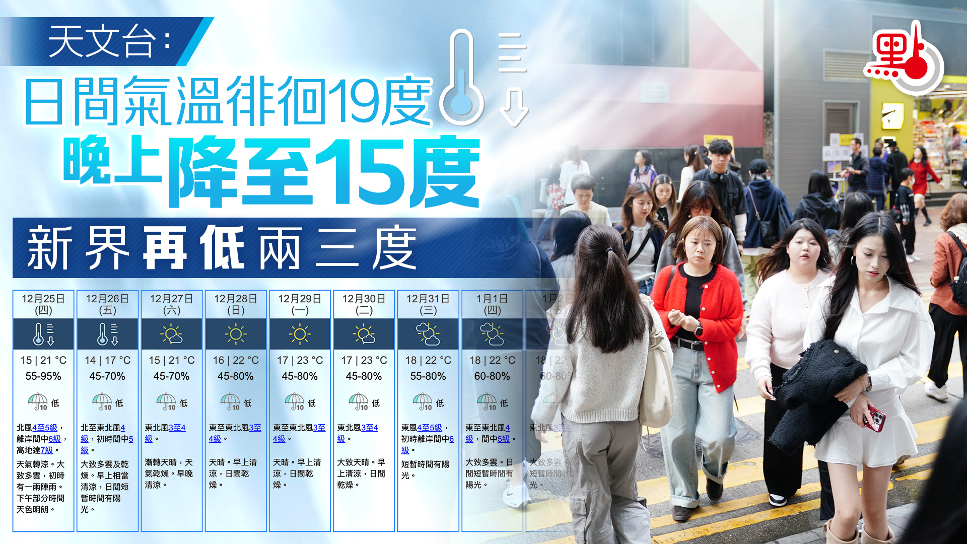 天文台:日間氣溫徘徊19度 晚上降至15度 新界再低兩三度