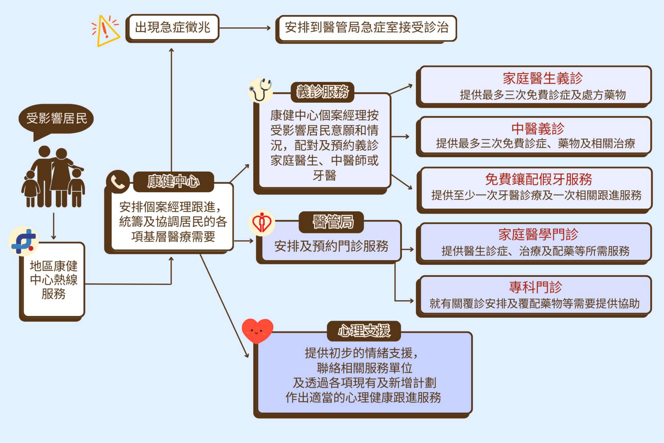 醫衞局會繼續為受影響居民提供全面基層醫療支援,並從居民的角度設計相關服務流程,讓他們只需透過康健中心便可獲得便捷及到位的醫療支援。
