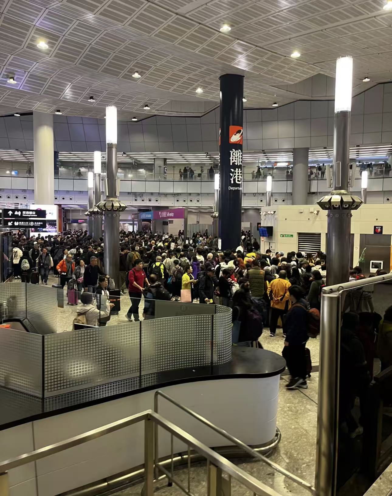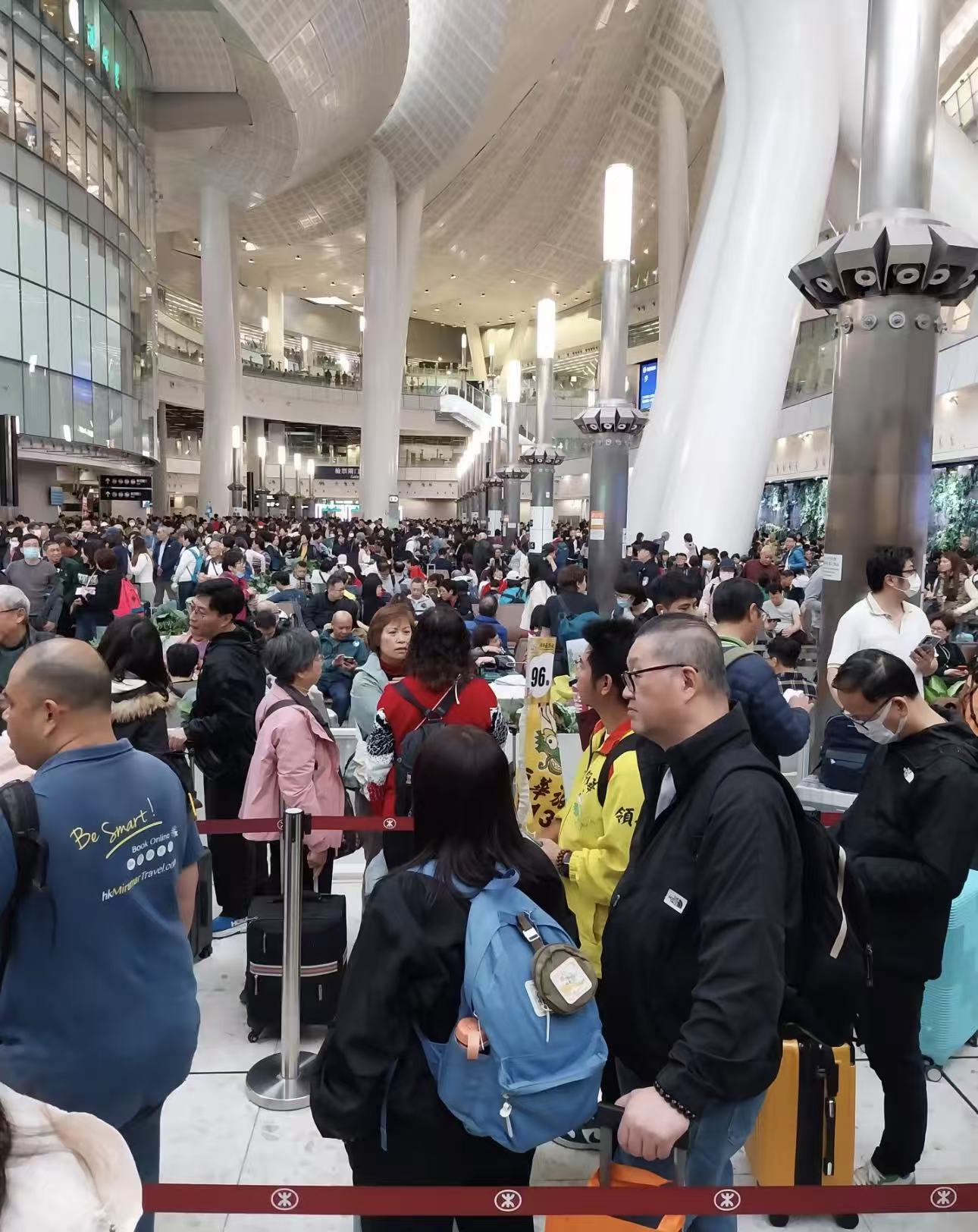 據網友描述,西九龍高鐵站早在清晨就已經排起長隊,站內人山人海,但海關櫃位全部開放,所以整體雖然擁擠但仍然順暢,提醒其他有出行需求的旅客提前預留充足時間排隊進站上車。