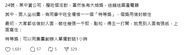 網民在Threads以「職場鬼故事」為話題發帖,文中稱,有公司派對抽禮物,當中有員工抽中全場唯一一個「特等獎」:「大家都估信封入面,裝住幾張一千蚊」,沒想到,信封內只有一張紙,上面寫:「可以同集團創辦人單獨對話1小時。」