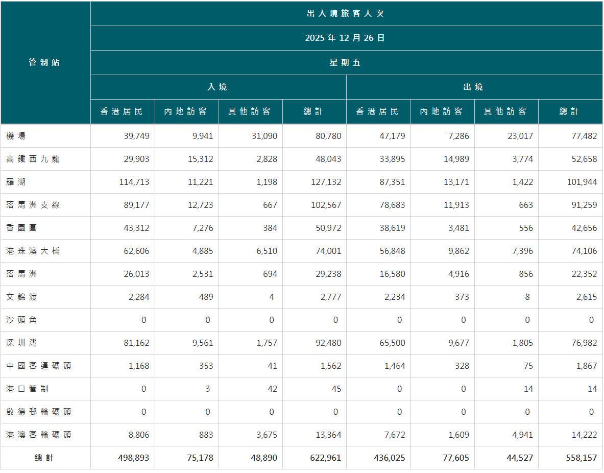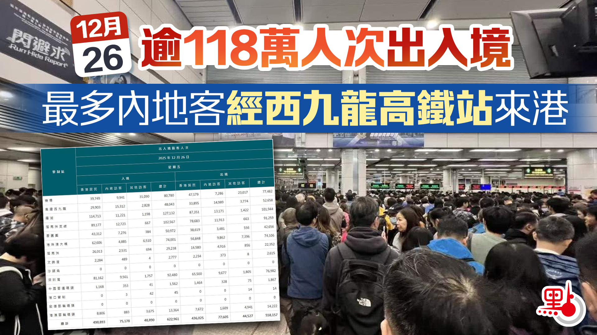 【點新聞報道】聖誕節長假期,根據入境處數字,昨日(26日)共有超過118.1萬人次經各管制站出入境,包括逾62.2萬人次入境,及逾55.8萬人次出境。