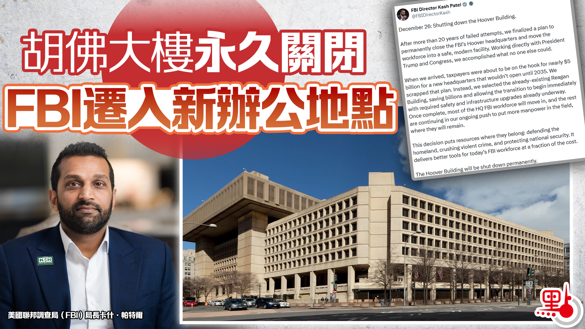 【點新聞報道】據央視新聞報道,當地時間12月26日,美國聯邦調查局(FBI)局長卡什·帕特爾表示,位於華盛頓特區、歷史悠久但設施老化的聯邦調查局總部胡佛大樓將被「永久關閉」,相關人員將遷入此前由美國國際開發署使用的一處辦公設施。