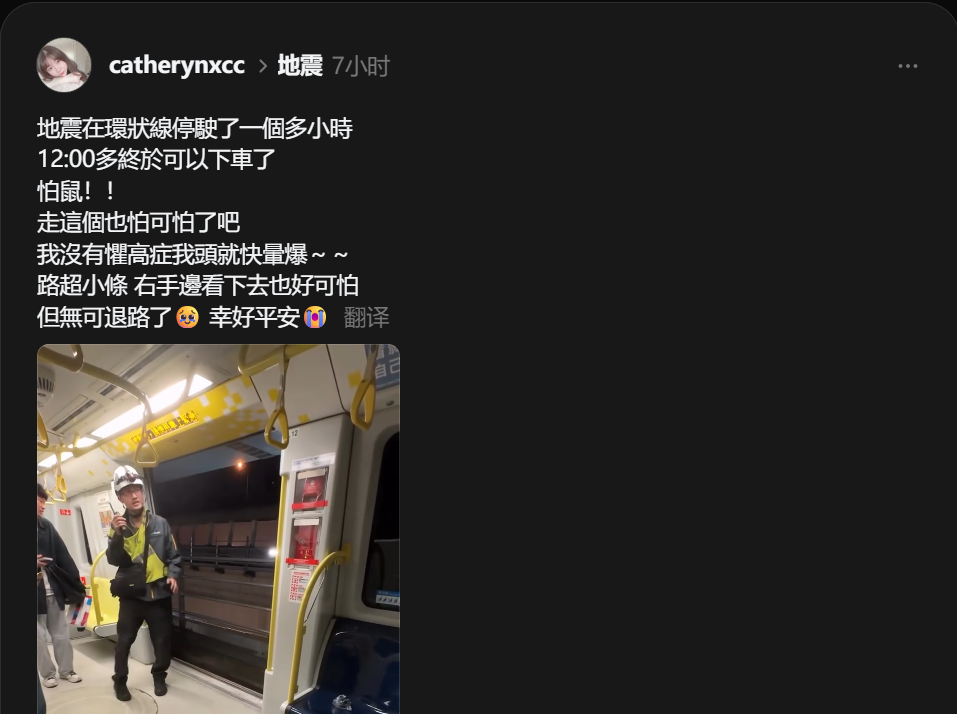 地震發生時,許多民眾搭乘捷運環狀線,因列車一度停駛,許多乘客被困在車內逾一小時,事後靠站務人員引導走軌道下車,才結束這場驚魂,直呼「第一次遇到這種況狀」、「真的太可怕」。