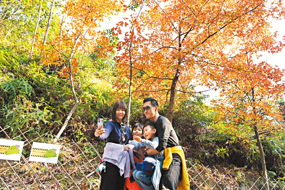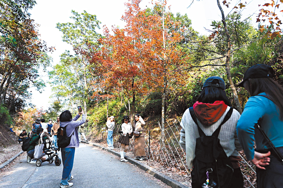 聖誕節小長假今日(28日)結束,不少留港市民趁昨日假期郊遊,欣賞香港的自然風光。大熱郊遊地點之一的元朗大棠楓香林近日迎來賞楓旺季,吸引大批市民及內地旅客專程到訪,現場人流絡繹不絕,更有市民沿途拍攝紅葉美景。當中除本地市民外,有深圳旅客透過社交平台慕名而來,感受香港郊野的紅葉景致,亦有市民幾乎每年到訪,見證楓樹漸成規模,持續支持本地自然景點,又認為香港尚有不少未曾探訪之地,值得一探。另外,為疏導乘客,港鐵公司昨日開設期間限定的賞楓專車。不過,有市民決定展開近3個小時行山之旅,到大棠觀賞紅葉,欣賞香港大自然的風光。