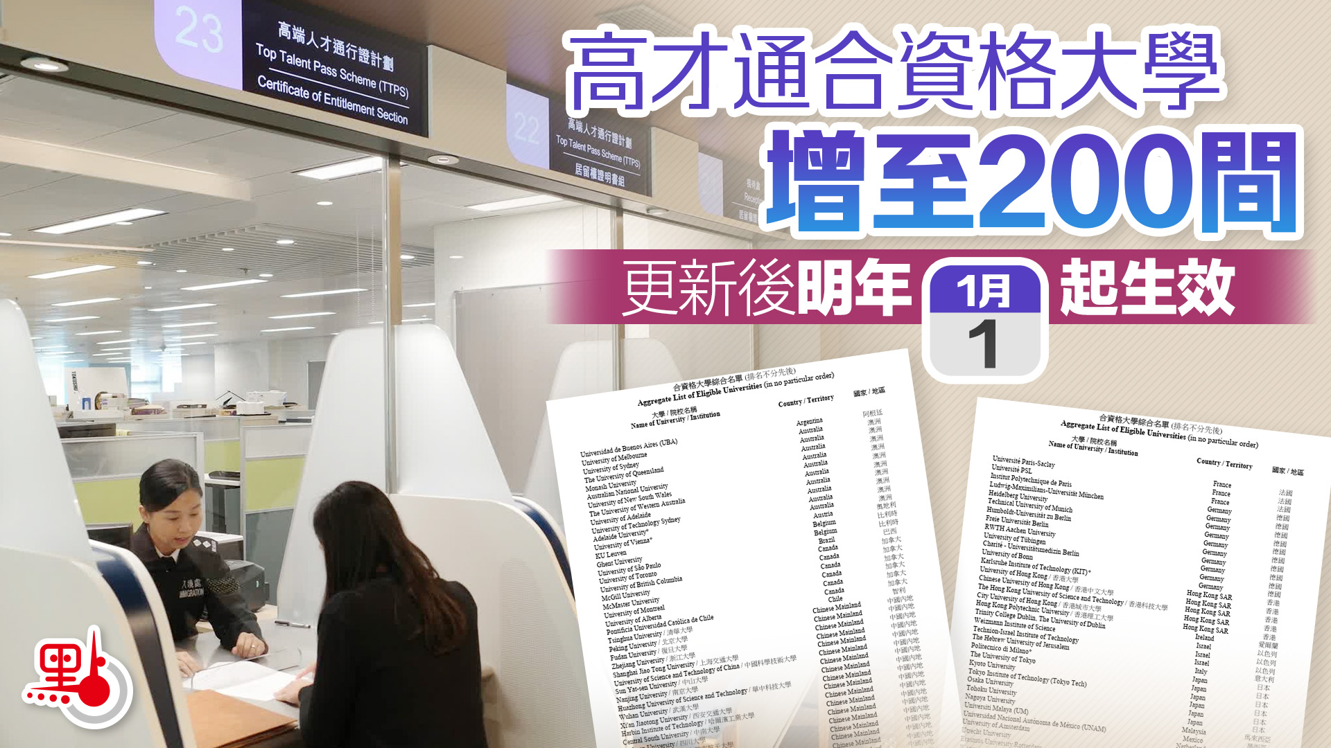 【點新聞報道】政府今日(28日)公布,高端人才通行證計劃(高才通計劃)經年度更新的合資格大學綜合名單將於2026年1月1日生效,名單因應有關大學排行榜的變動,由199間增至200間。