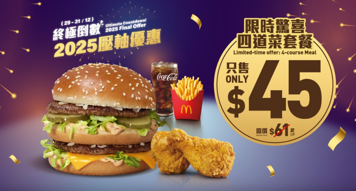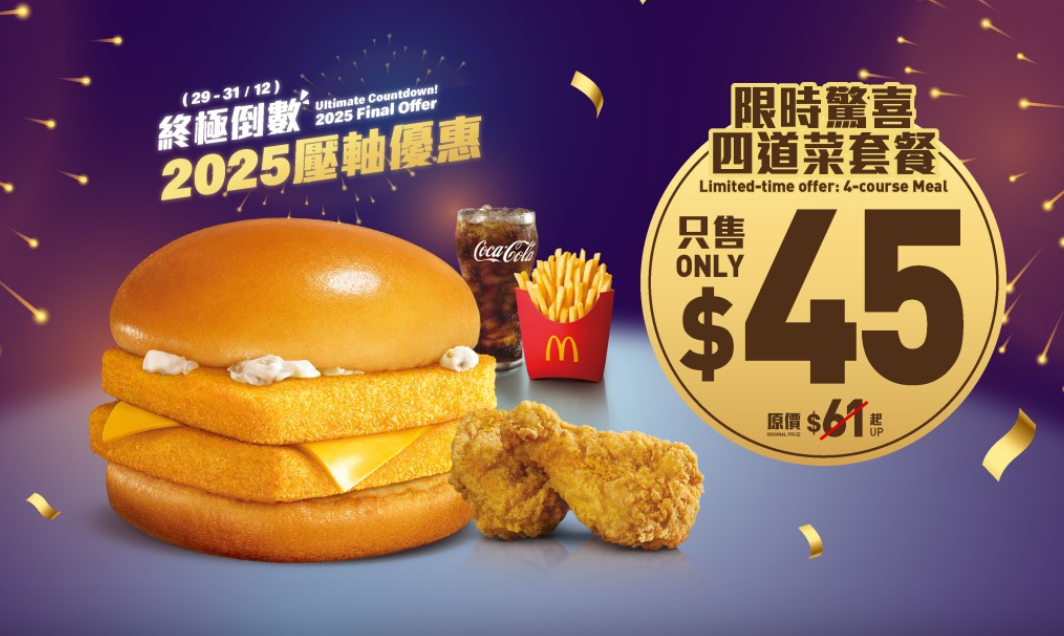 此外,麥當勞APP同步推出新一輪限時驚喜「$45四道菜套餐」,同樣於上午11時後供應。食客可從三款主食中任選其一,包括雙層魚柳飽、板燒雞腿飽或巨無霸超值套餐,並額外配搭2件脆香雞翼。一個價錢,便能一次過品嘗漢堡飽、薯條、汽水及雞翼,享受豐富四道菜盛宴,為2025年畫上滿足的句號。