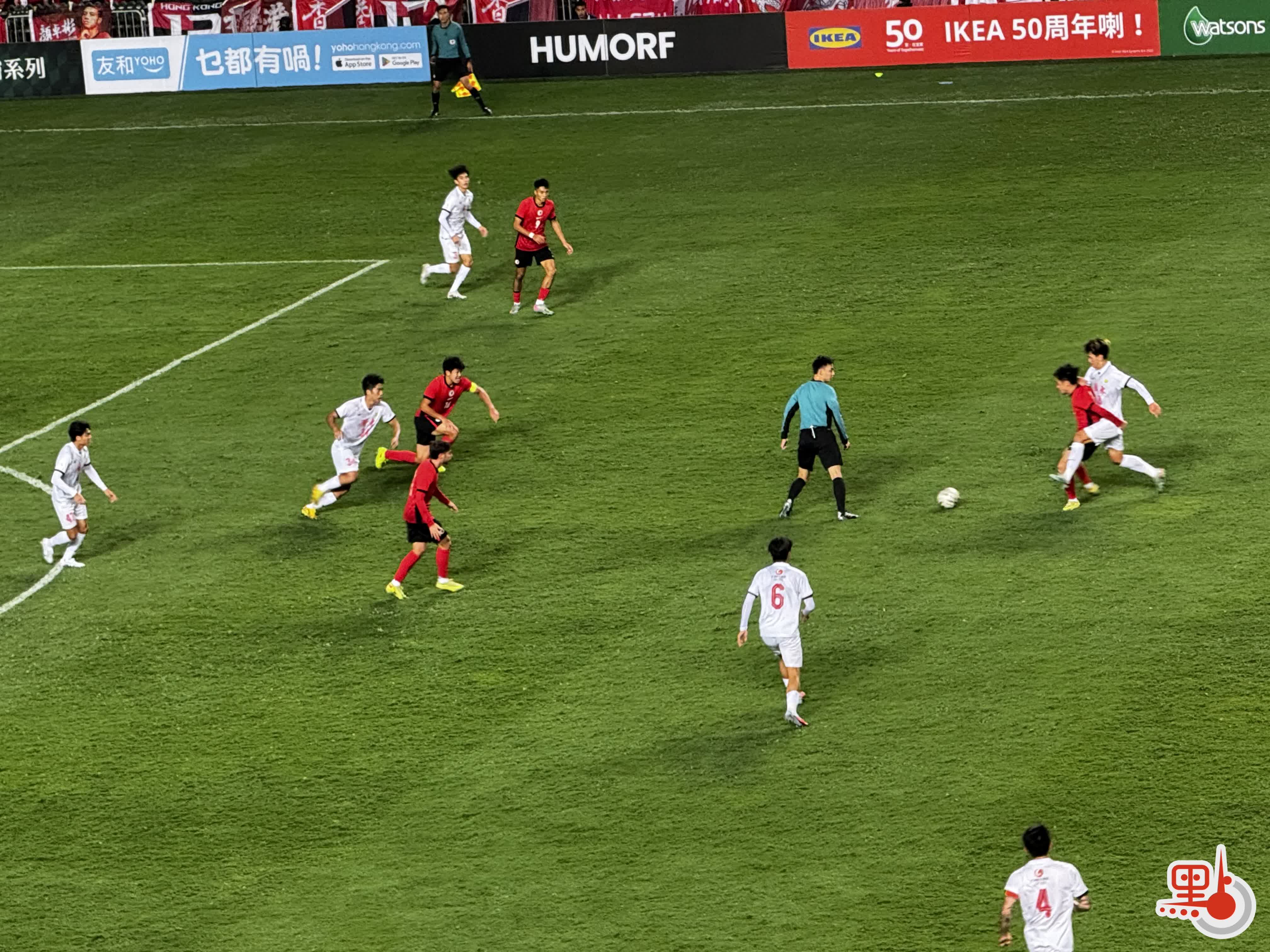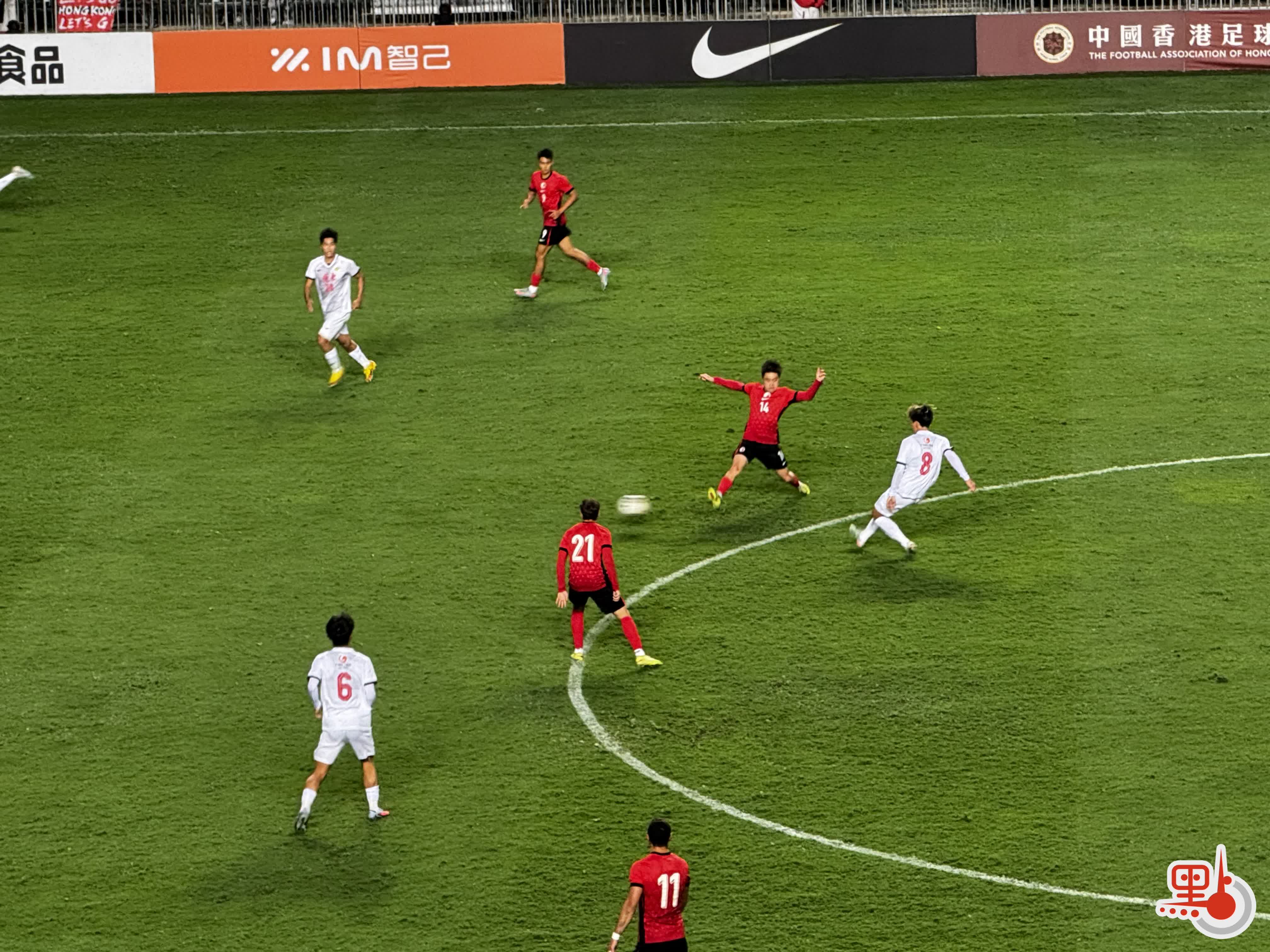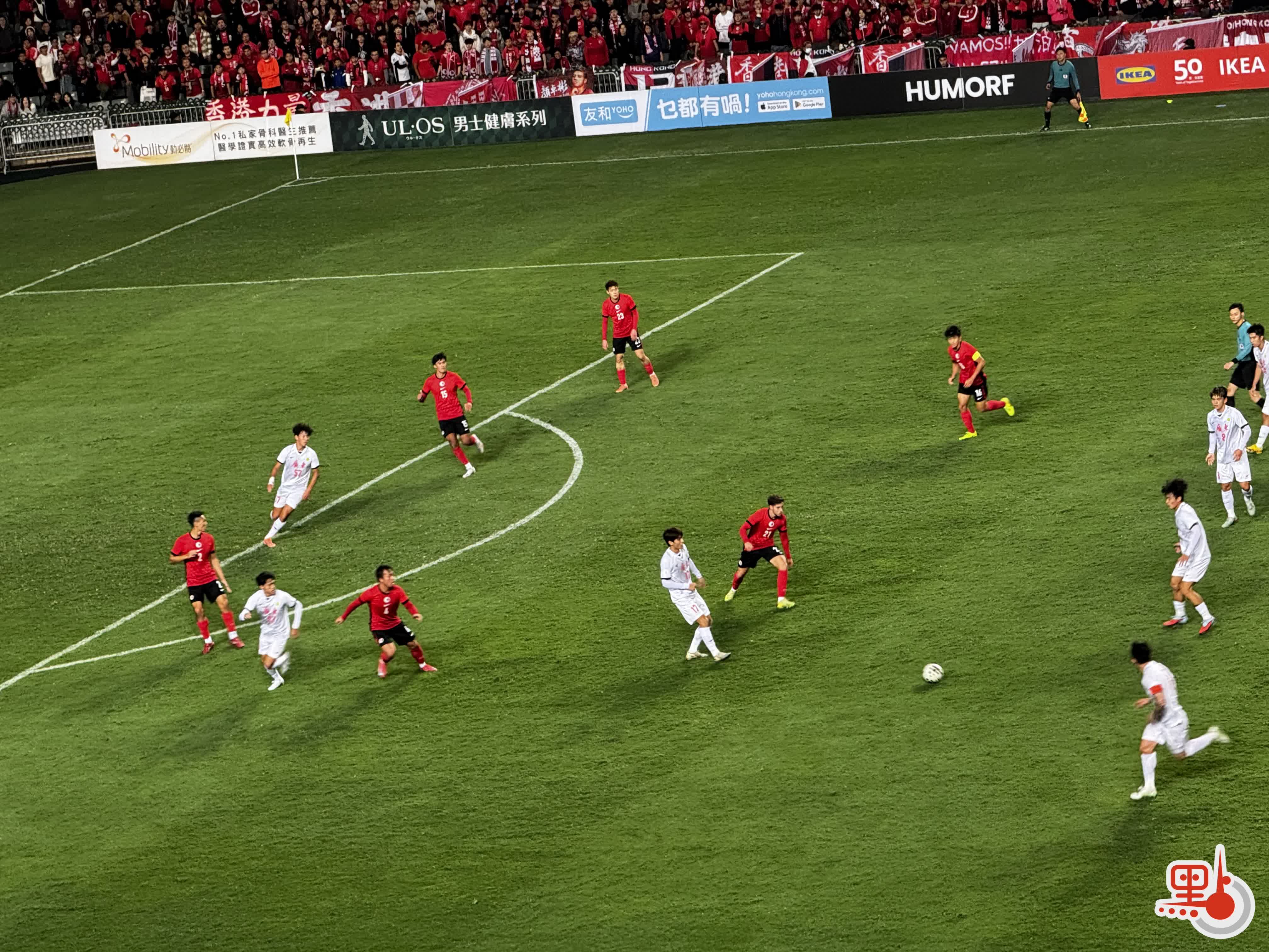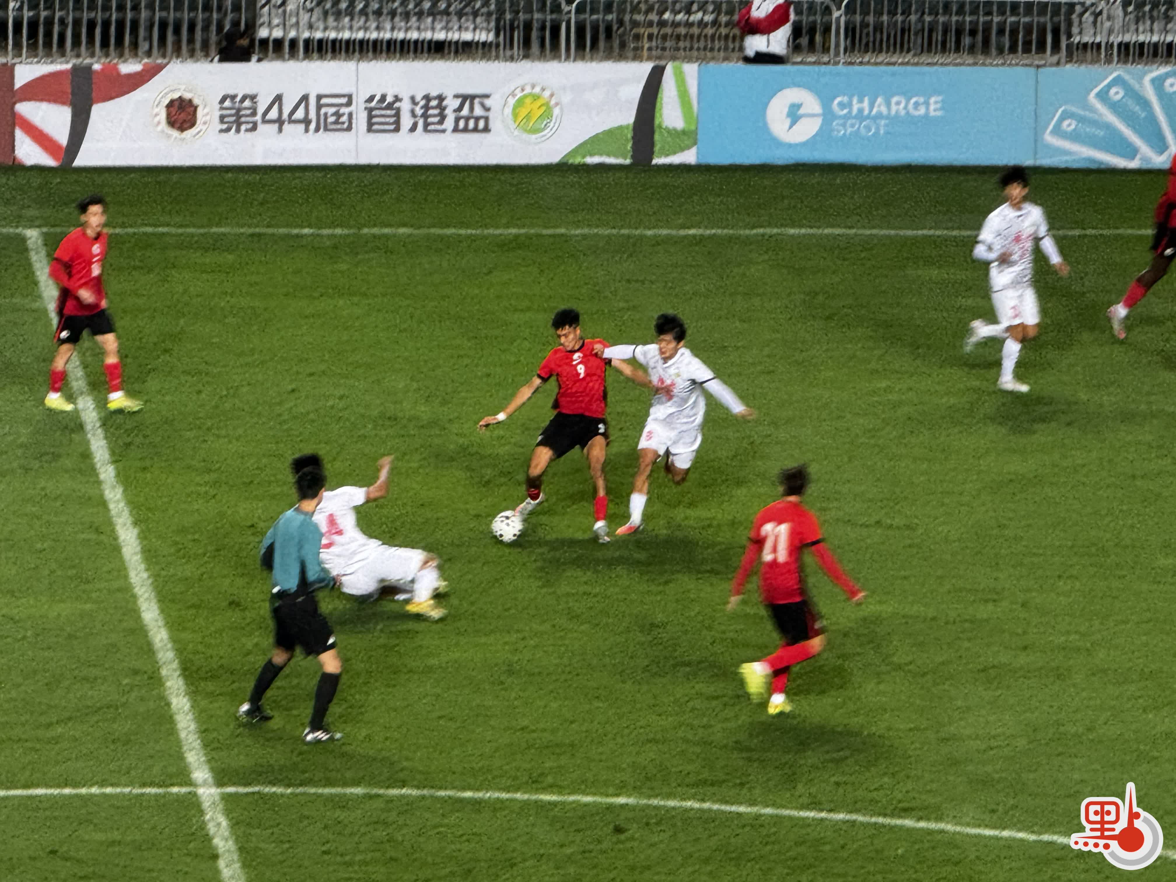 球賽現場化作一片壯觀的「紅色海洋」,身穿紅色球衣的香港球迷以一浪勝過一浪的熾熱助威聲,為港隊注入了強大動力。上半場,雙方互不相讓,攻防節奏明快。港隊憑藉主場氣勢創造多次威脅攻門,廣東隊防線則表現頑強,激烈的身體對抗令裁判數次出示黃牌。戰至上半場補時階段,港隊後衛孫銘謙把握機會,冷靜施射高難度破網,助球隊以1-0的領先優勢返回更衣室。