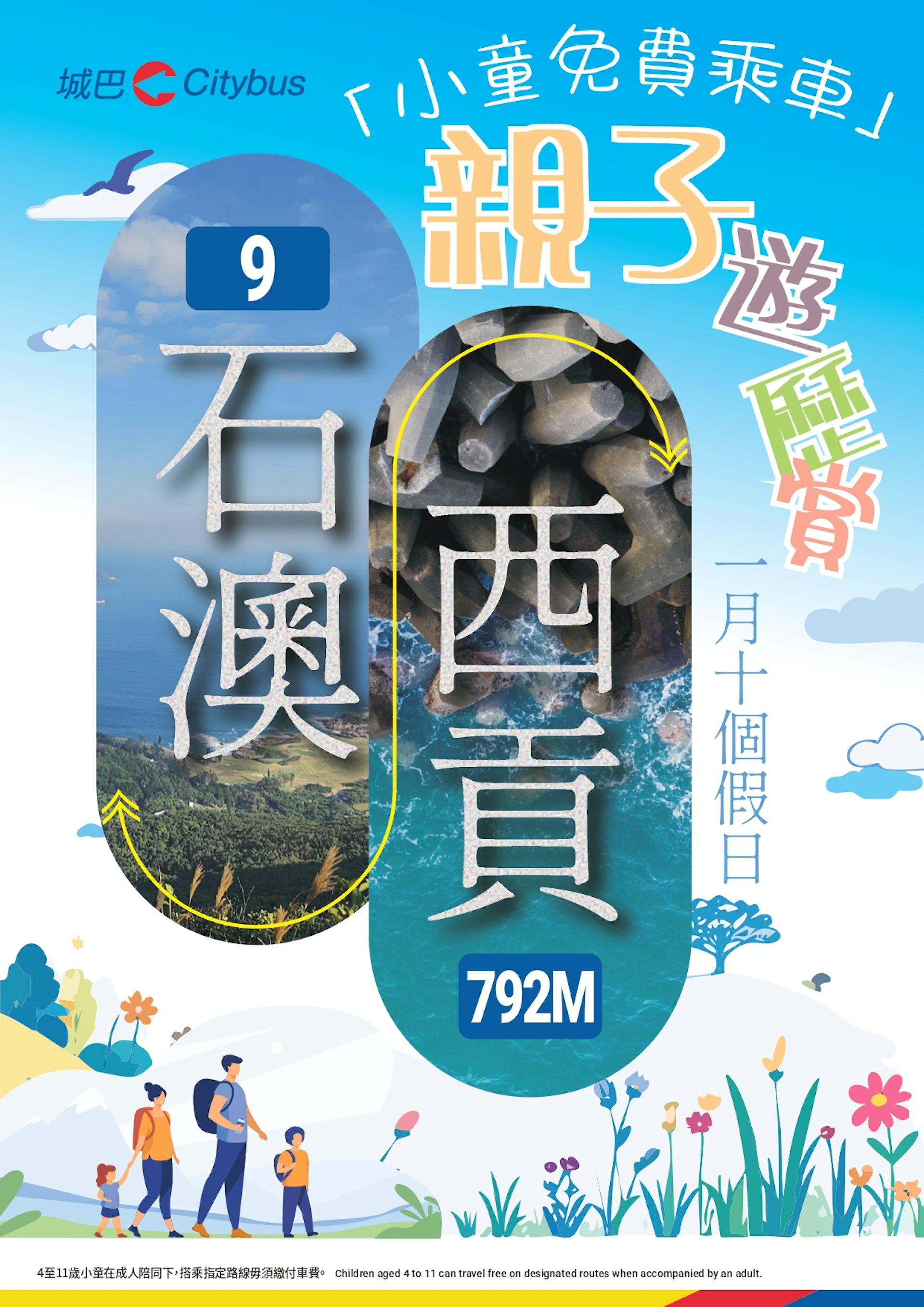城巴指,每位成人乘客可帶同一位4至11歲的小童參與「親子遊歷賞」小童免費乘車活動,成人乘客可於指定日子乘搭城巴9號及792M號線,登車時如常繳付車費,同行小童則無需繳付任何車費。優惠受有關條款及細則約束。城巴將密切留意上述兩條路線的客量需求,適時加強服務,便利一家大細冬日郊遊。如有查詢,可瀏覽城巴網頁或下載城巴手機應用程式,掌握有關路線的最新乘車資訊,及獲取最新消息。