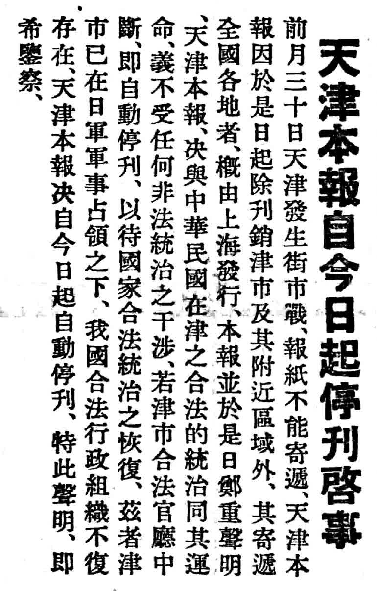 天津本報,決與中華民國在津合法統治同其運命,義不受任何非法統治之威脅。萬一津市合法官廳有中斷之日,則不論其為外國軍事佔領或出現任何非法的中國人之機關,本報將即日自動停刊。待國家合法的統治恢復之日,再繼續出版。