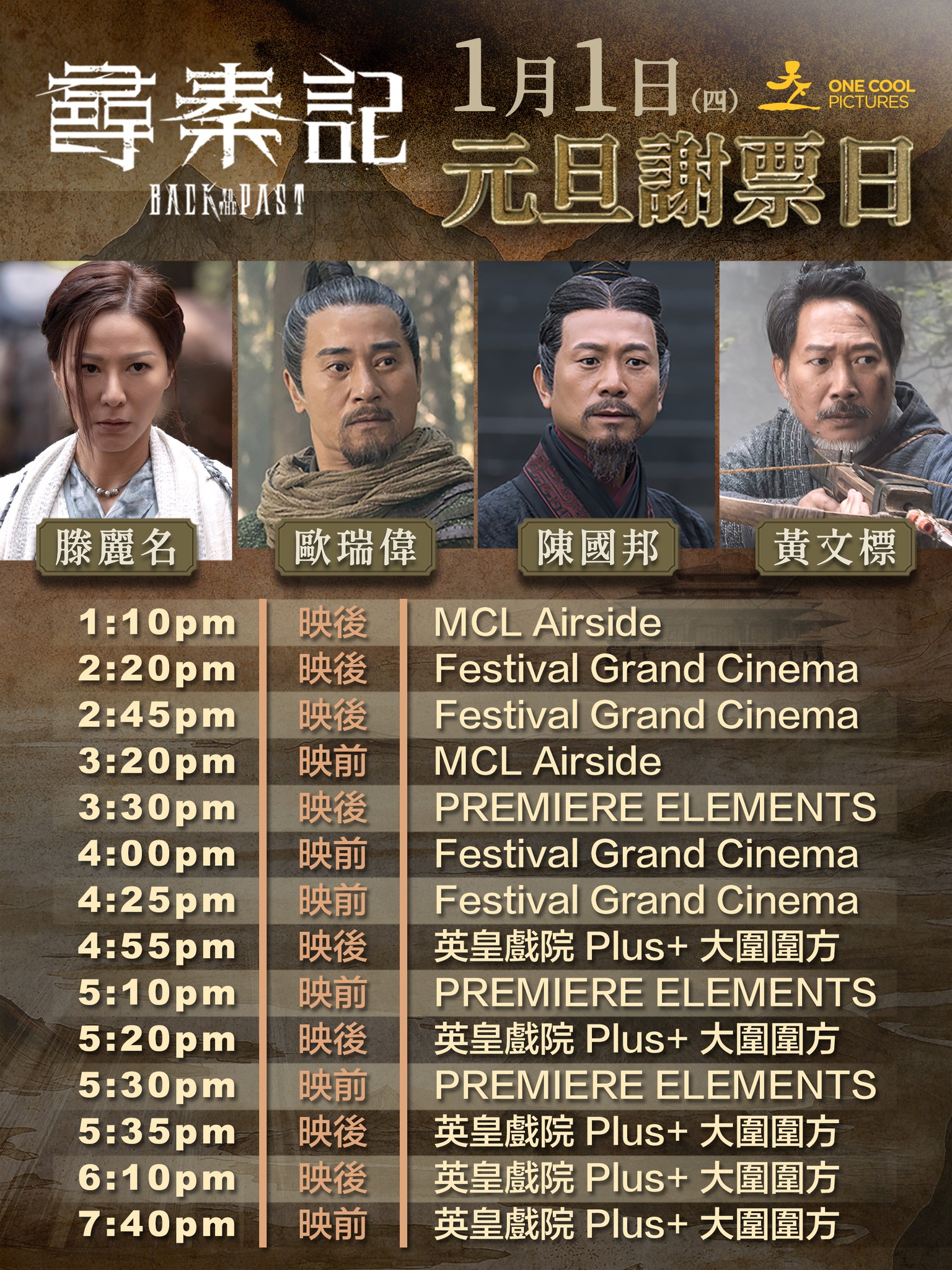 【點新聞報道】備受矚目的港產電影《尋秦記》今日(12月31日)上畫,MCL AIRSIDE、Festival Grand Cinema、PREMIERE ELEMENTS等多家戲院於社交平台宣布元旦(2026年1月1日)謝票場,電影中4位不可或缺的靈魂人物——陳國邦(飾李斯)、滕麗名(飾善柔)、黃文標(飾滕翼)、歐瑞偉(飾陶總管),將齊齊現身戲院同大家見面。