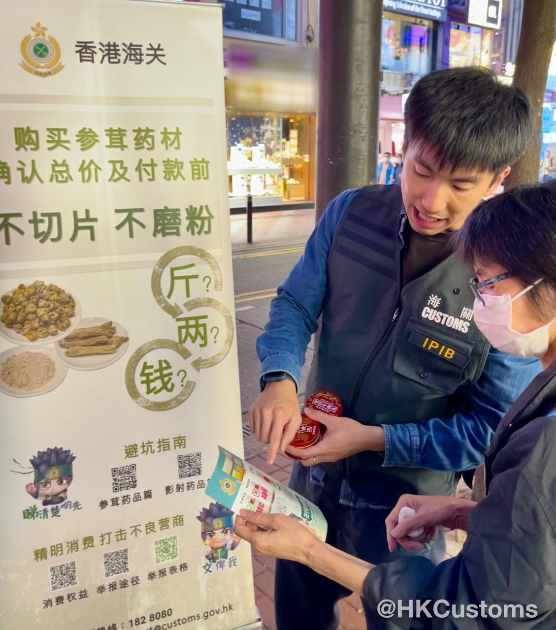 除了巡查工作,海關宣傳隊於聖誕至元旦兩星期連日到多個購物熱點,擺設攤位及派發宣傳單張,提醒訪港旅客購買參茸海味及中藥材時,要留意商品計價單位,並要求商戶確定商品總價,未確定總價之前,緊記不切片,不磨粉。