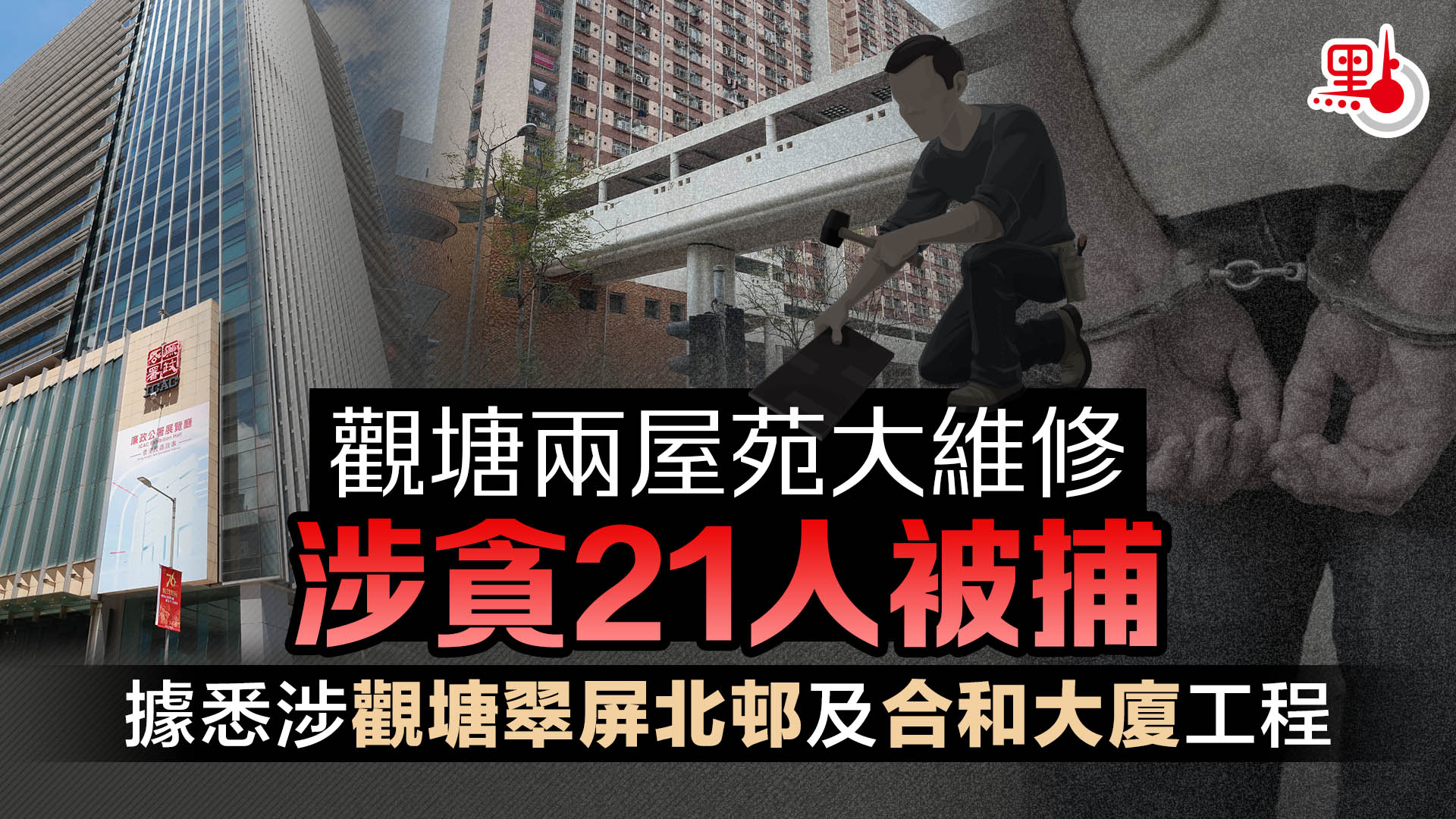 【點新聞報道】廉政公署(廉署)今日(2日)公布,上星期採取執法行動,打擊一個有黑社會背景人士操縱的樓宇維修貪污團夥,涉及觀塘區兩個屋苑的大維修工程,先後拘捕共21名人士,包括該貪污團夥的骨幹成員。最新消息指,事件分別涉及翠屏北邨及合和大廈工程。