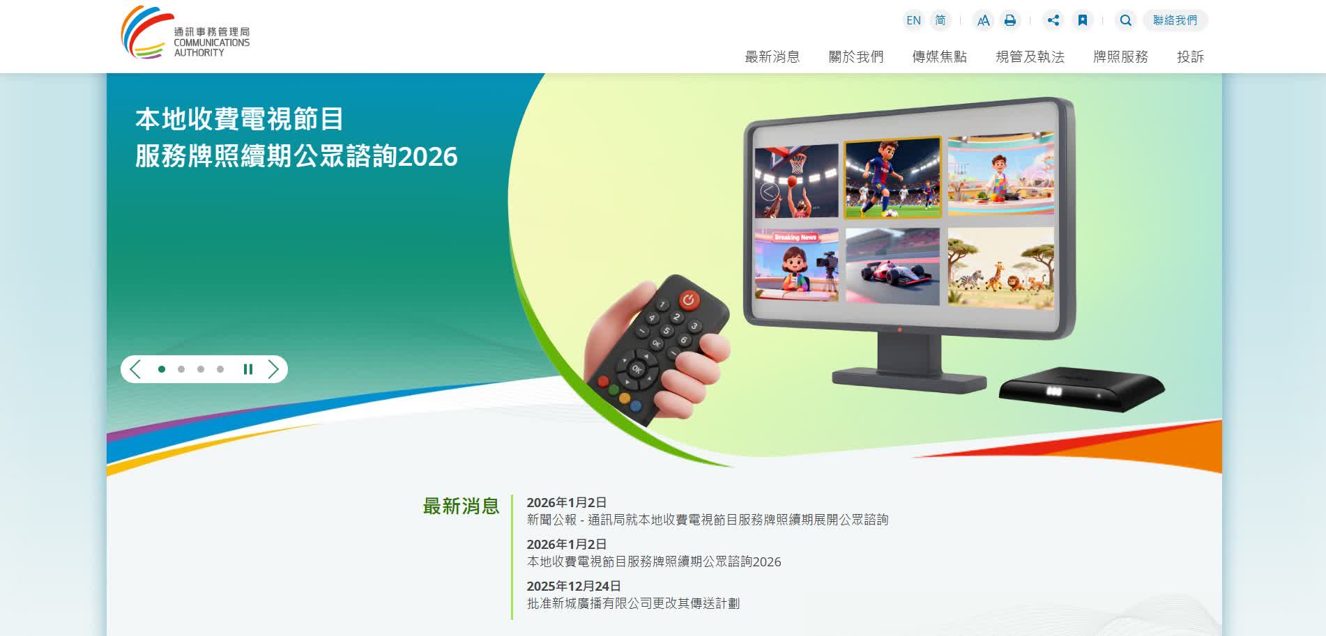 通訊事務管理局(通訊局)今日(1月2日)就本地收費電視節目服務(收費電視)牌照的續期申請,展開為期1個月的公眾諮詢。