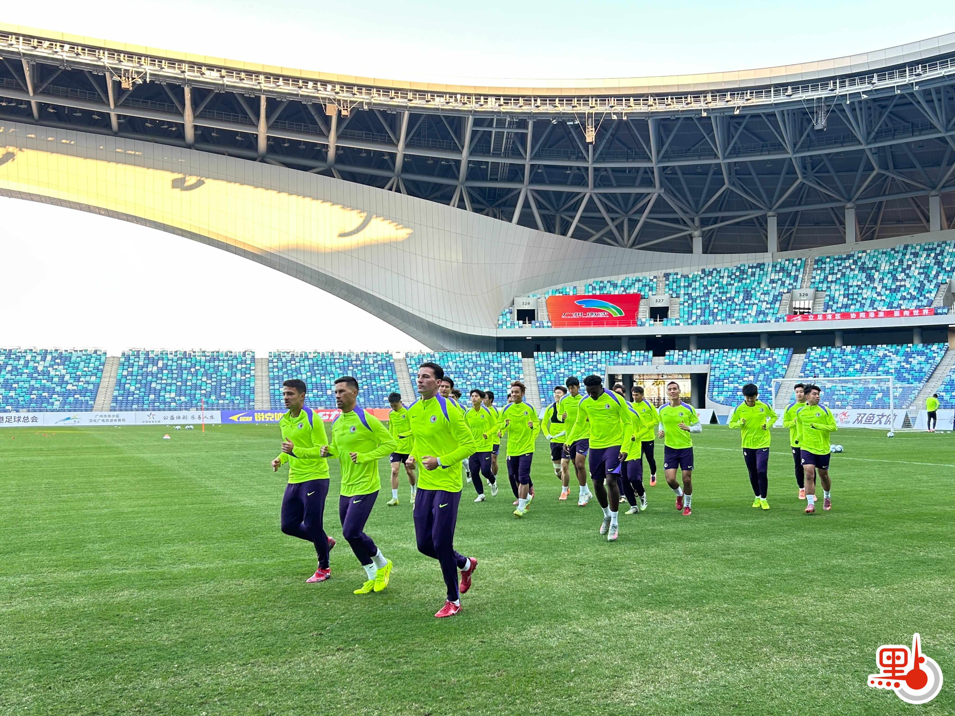 2日下午5時左右,港隊教練員、隊員一行近30人來到大灣區文化體育中心,立即投入緊張的訓練。在進行了場地草皮適應和體能訓練後,全體隊員在教練組的指導下進行了技戰術演練。記者現場所見,港隊人員齊整,在首回合比賽中攻破廣東隊球門的孫銘謙、艾華頓均出現在訓練場地中。