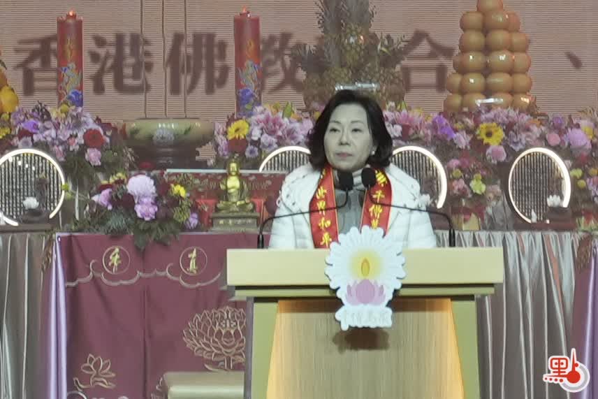 寬運法師在致辭時祝福現場善信「元旦吉祥,身心安康」。他指,香港在過去一年展現韌勁和生機,希望藉助本次一系列佛教活動,向世界傳遞和平信號,願國家昌盛、香港繁榮。