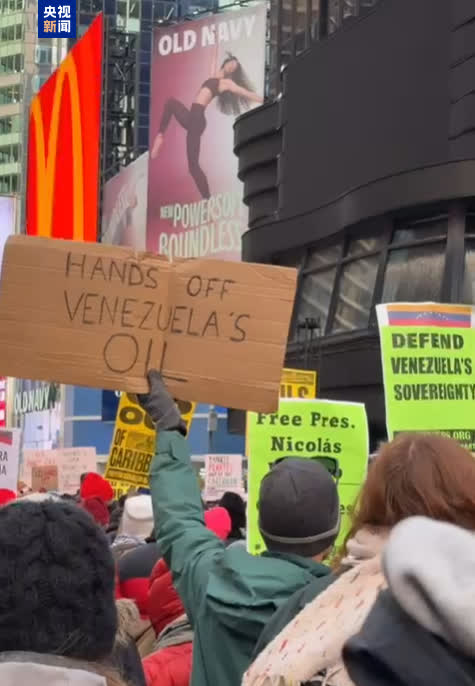 在紐約,人們聚集在時代廣場的美國陸軍徵兵辦公室外,手持反對對委內瑞拉開戰的標語。
