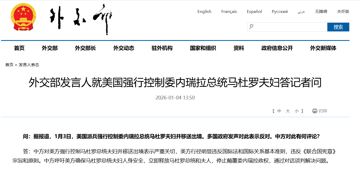 發言人表示,中方對美方強行控制馬杜羅總統夫婦並移送出境表示嚴重關切,美方行徑明顯違反國際法和國際關係基本準則,違反《聯合國憲章》宗旨和原則。中方呼籲美方確保馬杜羅總統夫婦人身安全,立即釋放馬杜羅總統和夫人,停止顛覆委內瑞拉政權,通過對話談判解決問題。