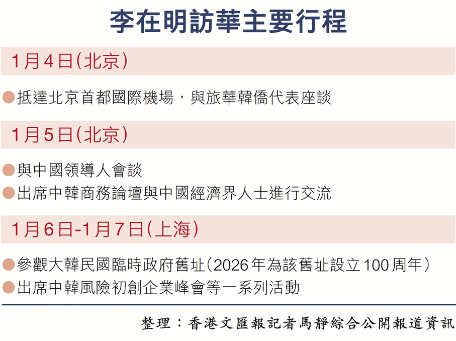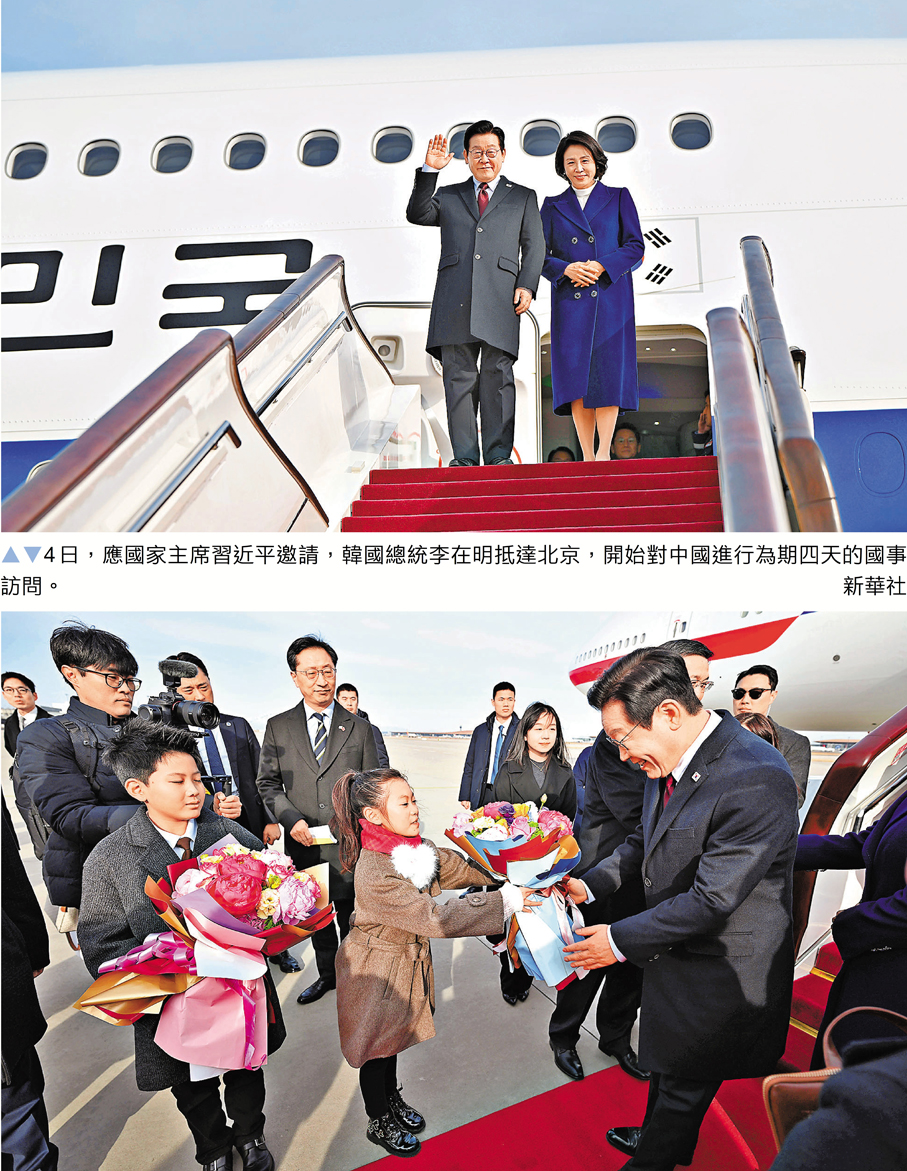 應國家主席習近平邀請,韓國總統李在明1月4日抵達北京,開始對中國進行為期四天的國事訪問。李在明4日在北京與在華韓國僑民會面時表示,韓中關係的全面恢復是本屆政府最重大的外交成就之一,韓方將盡最大努力加強兩國政府在相互尊重和體諒基礎上的溝通合作。他還稱,韓中兩國在產業合作方面擁有「無限機會」。訪華前,李在明再次明確表態,韓國始終尊重一個中國原則,對中國最核心的關切——台灣問題,將一如既往地秉持尊重一個中國的立場。此外,由三星電子會長李在鎔等200多名韓企代表組成的「經濟天團」隨同訪華,聚焦人工智能等高科技產業合作。