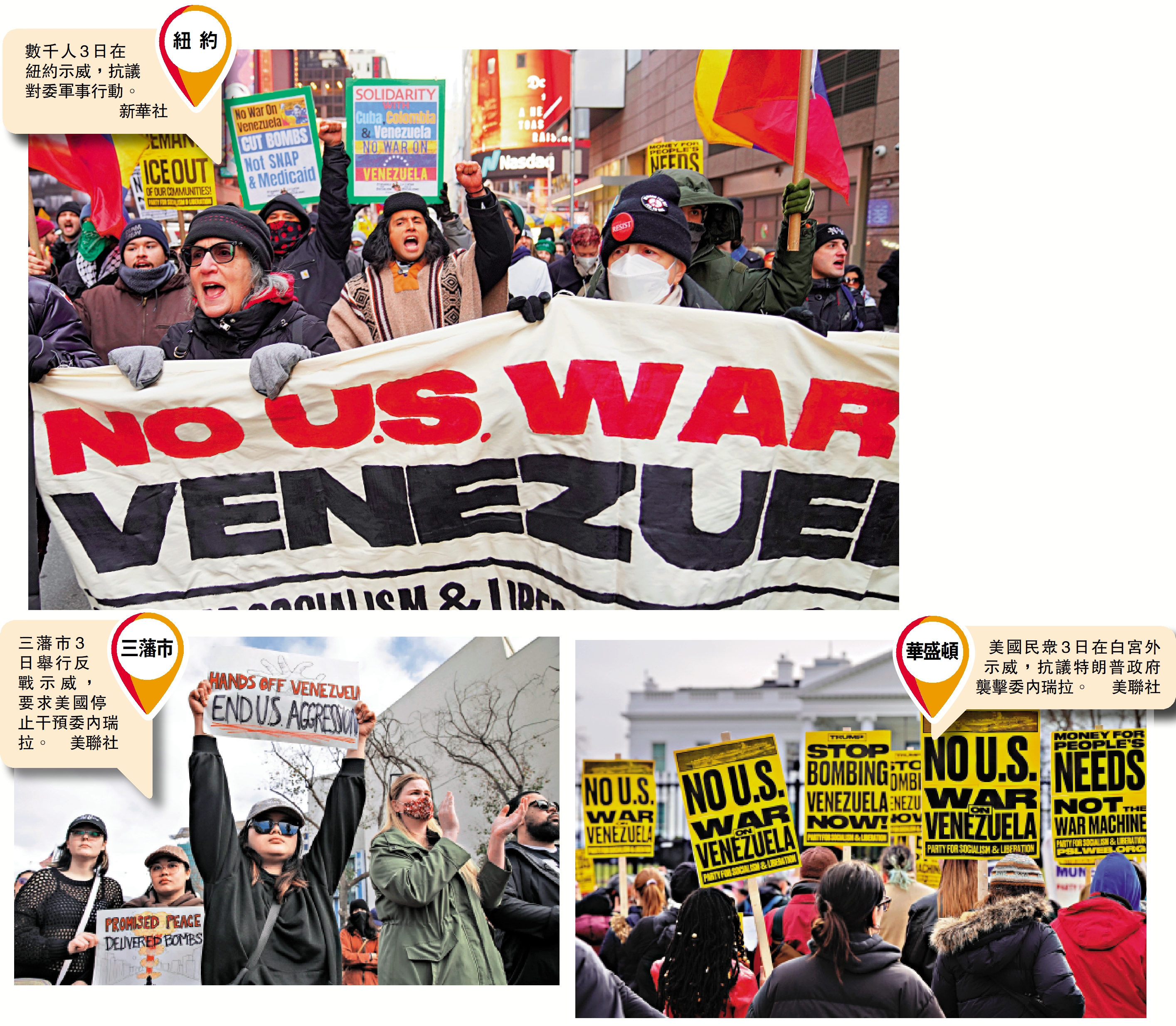 在白宮外,示威者手持「不要為石油流血」等標語。數百人在芝加哥參加示威,批評美國抓走馬杜羅的行動是「未經國會批准的帝國主義行為」。示威者丹尼說:「我今年37歲,是在伊拉克戰爭時期長大的。今天早上,我忍不住在想,天哪,我們又要重蹈覆轍了。」一名參加示威的高中教師說,他擔心自己的學生被送上戰場,「戰爭是我們最不需要的東西」。
