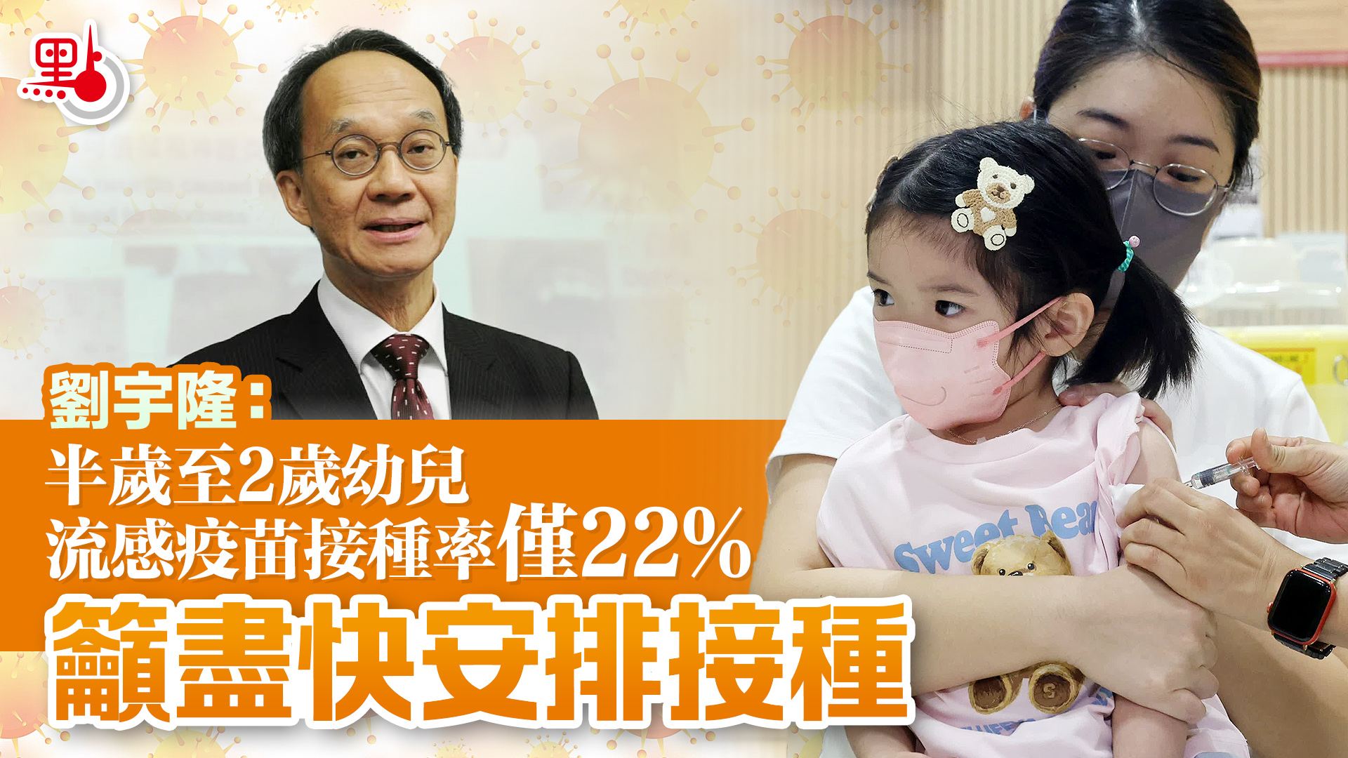 【點新聞報道】截至元旦,夏季流感高峰期錄得25宗涉及兒童流感嚴重個案,包括3宗死亡個案。疫苗可預防疾病科學委員會主席、港大兒童及青少年科學系講座教授劉宇隆今日(5日)在電台節目表示,大部分嚴重和死亡個案都未接種疫苗,6個月大至2歲幼兒接種率只有22%,強調疫苗可預防流感嚴重或死亡個案,呼籲家長盡快安排子女接種。