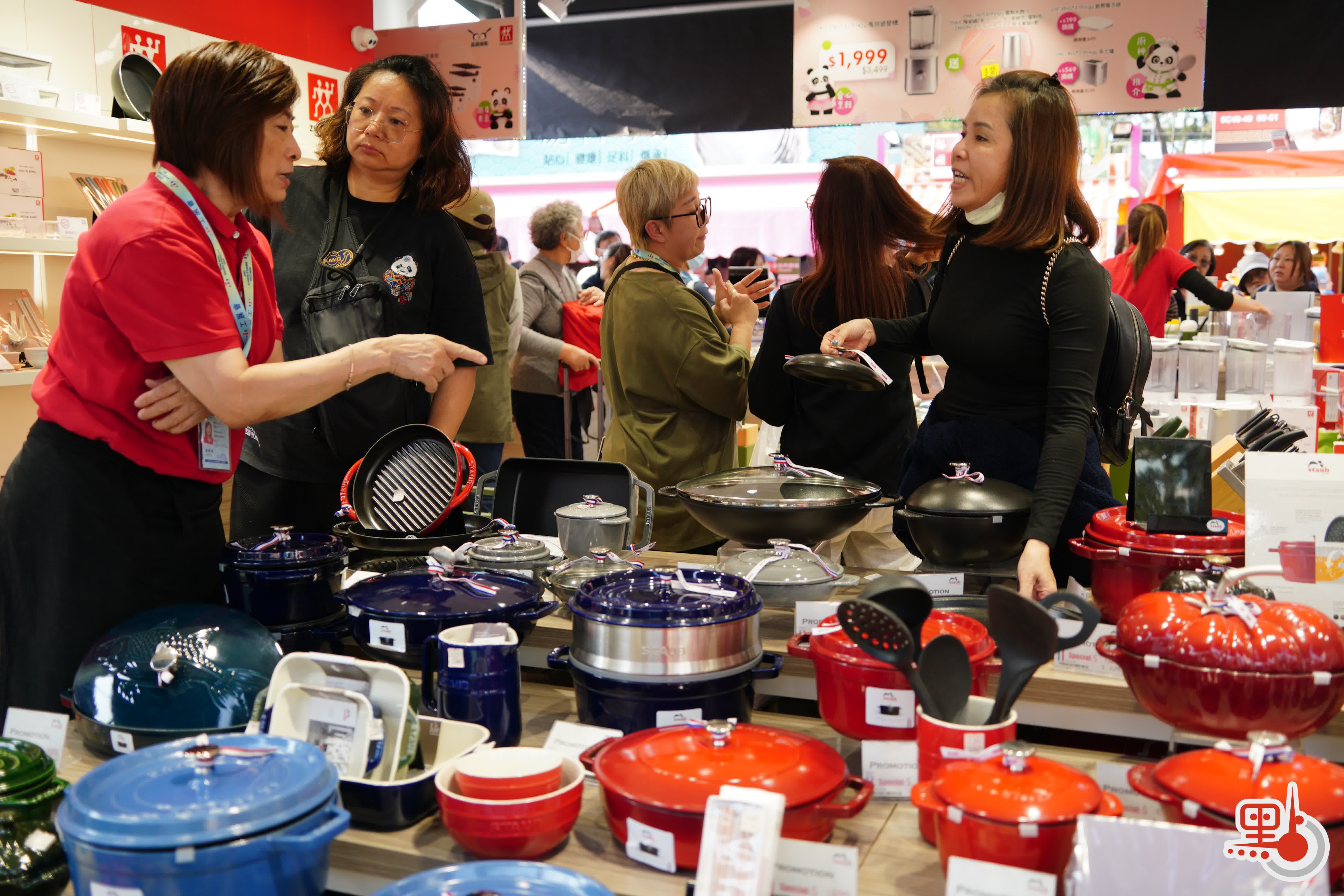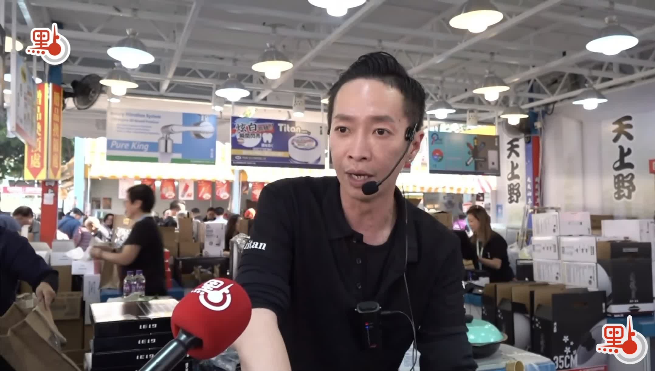 「天上野」舖位前人頭湧湧,工作人員忙個不停。他向點新聞記者介紹,舖位主要售賣鐵鑊等廚房用品,其中王牌產品鐵鑊備有過千套,下午3時左右已近乎售罄。他亦指是次展會生意有提升,十分感謝街坊幫襯。