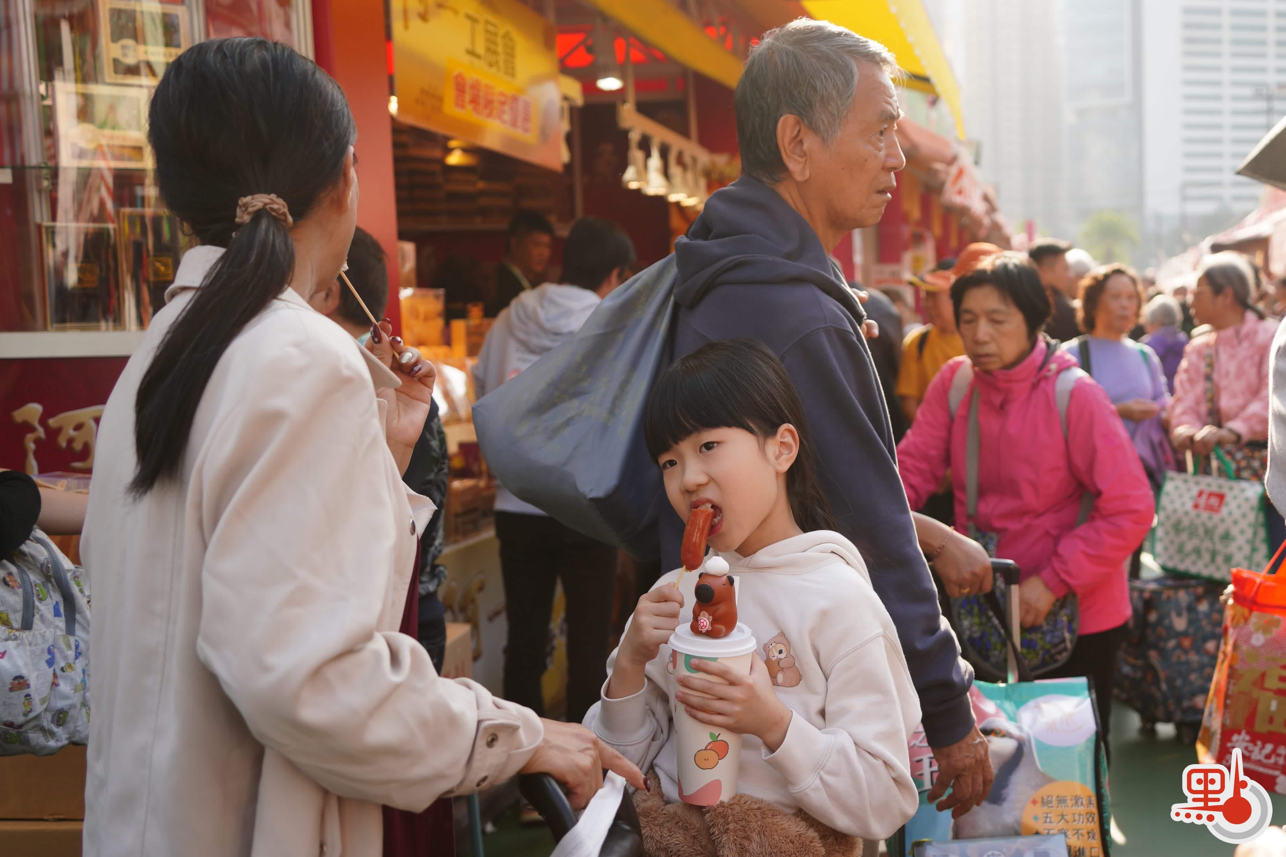 「蛋撻王」商舖前擺着琳瑯滿目的小食。其負責人透露,由於今日為最後一日,稍後部分食品會特價售賣。他指,攤位此次推出「開心果醬脆魚皮」等創新食品,銷量不俗,未來會朝類似方向開發更多產品。回顧是次展會,他認為整體安排尚可,惟免費入場時間過短,希望未來能優化開放時間,讓市民有更充裕的時間逛展。