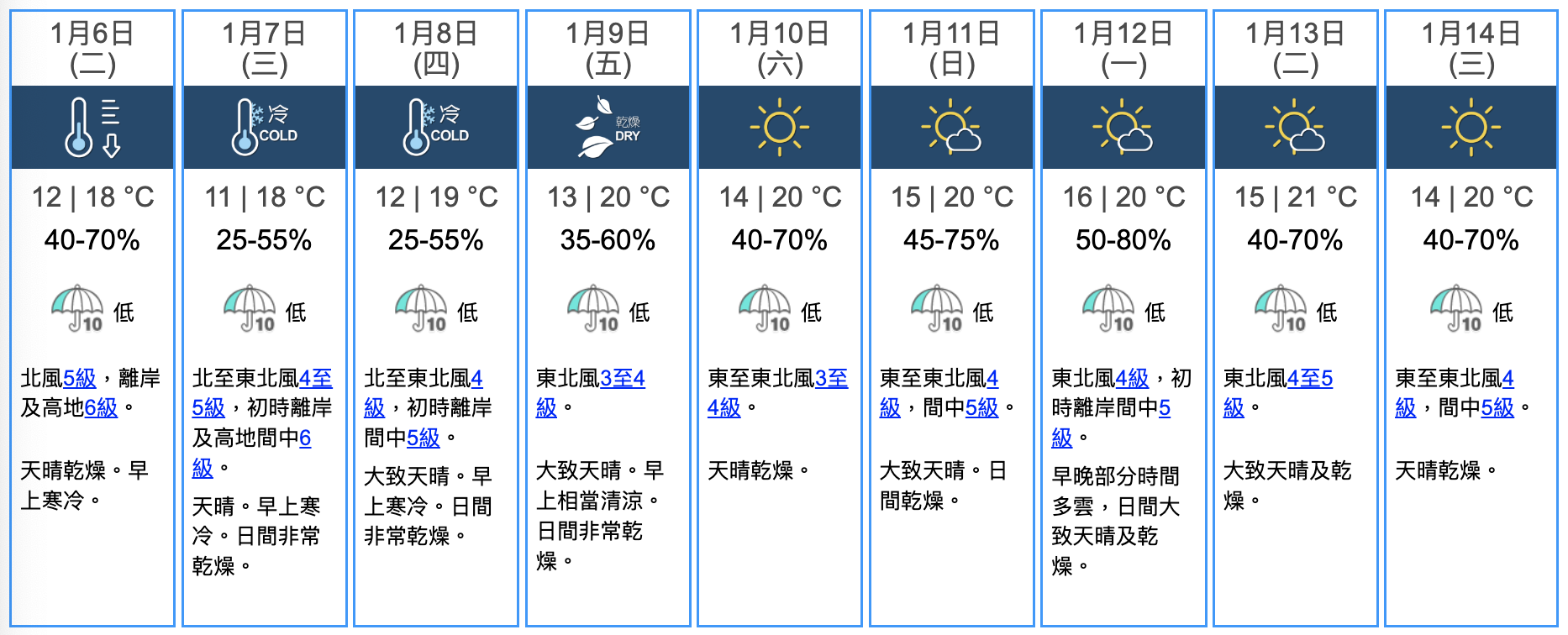 【點新聞報道】入冬以來,本港天氣持續溫暖,明顯的「冬季體驗」遲遲未至。然而,一道季候風正為華南地區帶來較長時間的影響,天氣轉冷。天文台表示,今日(6日)早上市區最低氣溫約在12度左右,而寒冷天氣將會持續,預料本周三(7日)及周四(8日)早上市區最低氣溫進一步降至約11至12度,新界地區會再低幾度。日間天氣則非常乾燥。