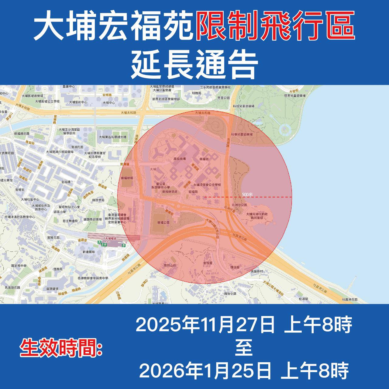 【點新聞報道】警方今日(6日)表示,鑒於公眾安全,警務處在大埔宏福苑範圍已設立「限制飛行區」,生效時間將由2026年1月11日上午8時延長至2026年1月25日上午8時。