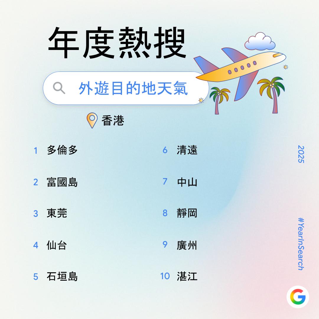 令人痛心的大埔「宏福苑」大火分別成為「熱搜關鍵字」第二位及「熱搜本地頭條」榜首。天氣與公共衞生議題另各佔三則「熱搜本地頭條」:面對破紀錄的熱帶氣旋警告及頻發的黑色暴雨,港人以Google搜尋查詢「黑雨」、「熱帶風暴韋帕」及「超強颱風樺加沙」相關的即時實用資訊,應對挑戰;「基孔肯雅熱」和「諾如病毒」傳染病資訊,毒品「依托咪酯(太空油毒品)」亦備受關注。