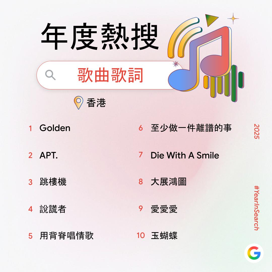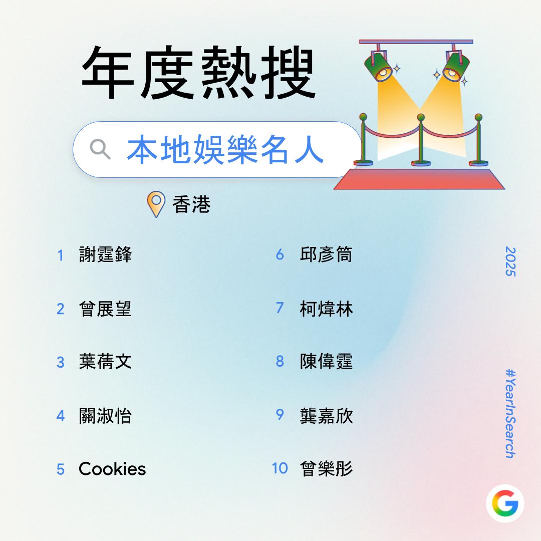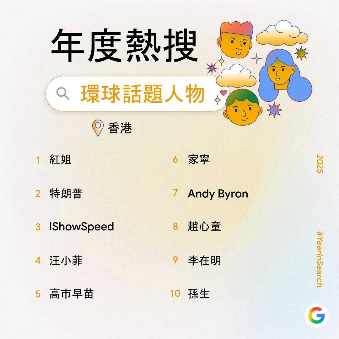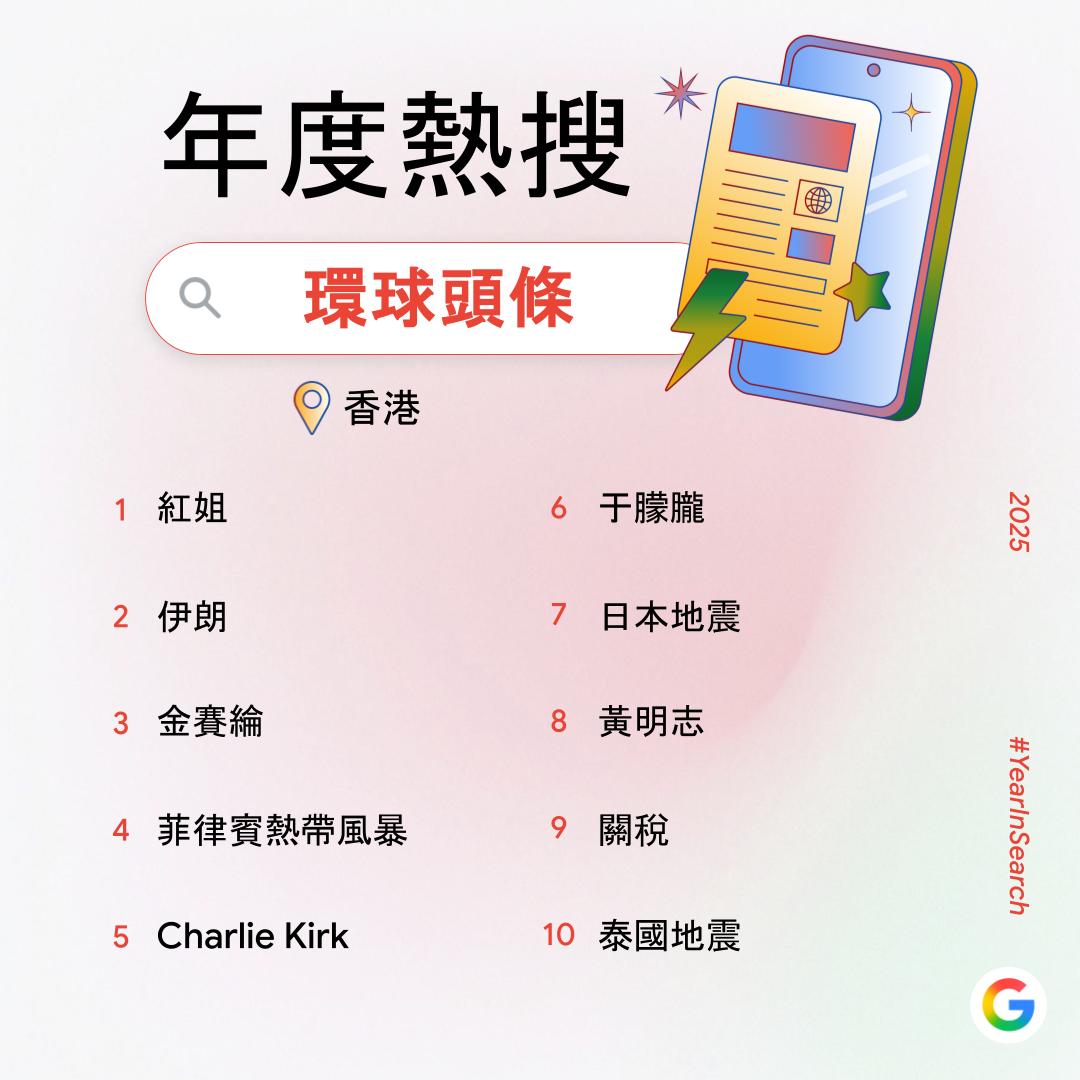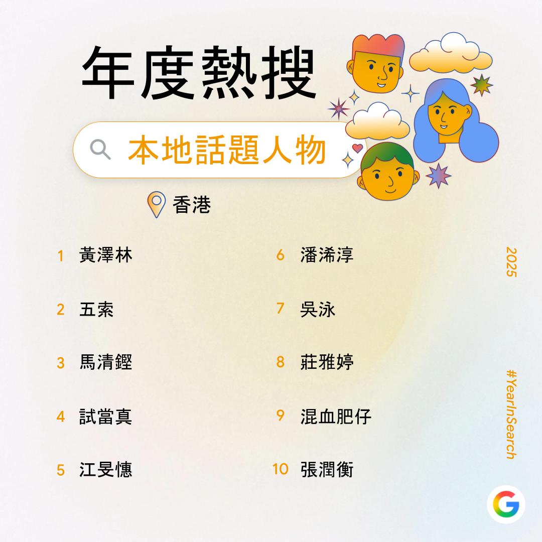 【點新聞報道】過去一年,你在網上搜索了什麼?Google香港今日(6日)公布2025年度搜尋榜,彙整去年搜尋量飆升得最高的關鍵字,透過數據回顧2025年港人關注的話題。搜尋榜共有14份榜單,涵蓋詞彙、時事、人物、娛樂及休閒範疇。