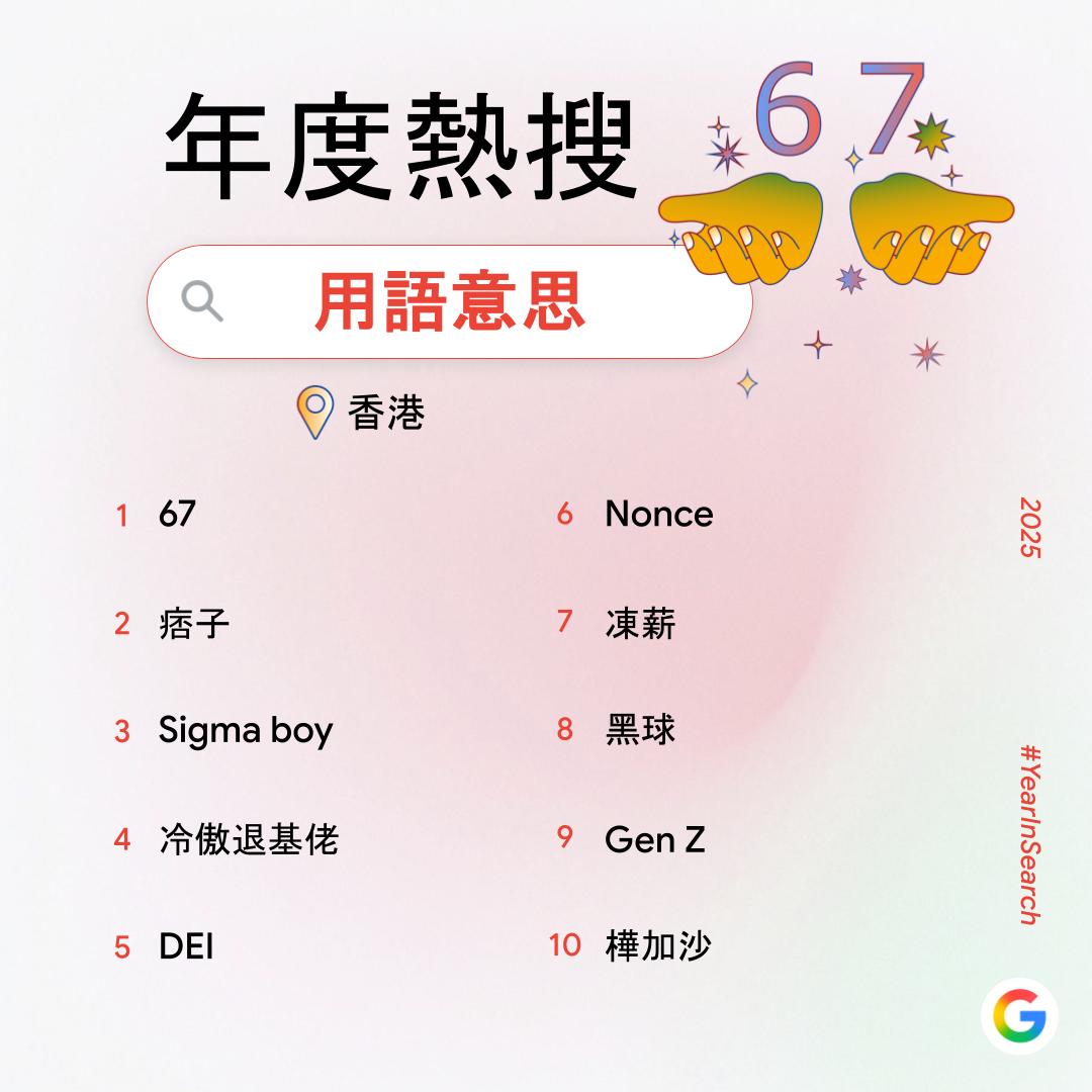 人工智能(AI)工具佔十大「熱搜關鍵字」四席,包括榜首的「DeepSeek」,「Grok」、「豆包」和「Google Gemini」,反映港人積極探索不同AI工具,對AI應用的興趣及需求顯著。「熱搜用語意思」則由全球Z世代和Alpha世代中流行的「67」踞榜首。