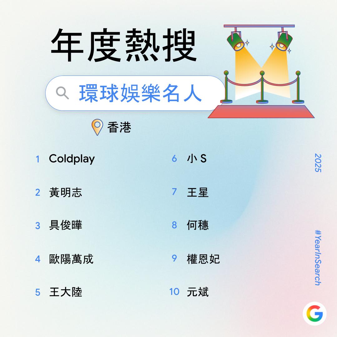 娛樂方面,闊別多年再度在港舉行個人演唱會的「謝霆鋒」登上「熱搜本地娛樂名人」及「熱搜演唱會」第一位,其經典歌曲之一「玉蝴蝶」亦位列「熱搜歌曲歌詞」第10位。「熱搜環球娛樂名人」榜首為國際天團「Coldplay」,其演唱會也列「熱搜演唱會」第10位。此外,「熱搜歌曲歌詞」榜首則為風靡全球的動畫電影主題曲「Golden」。