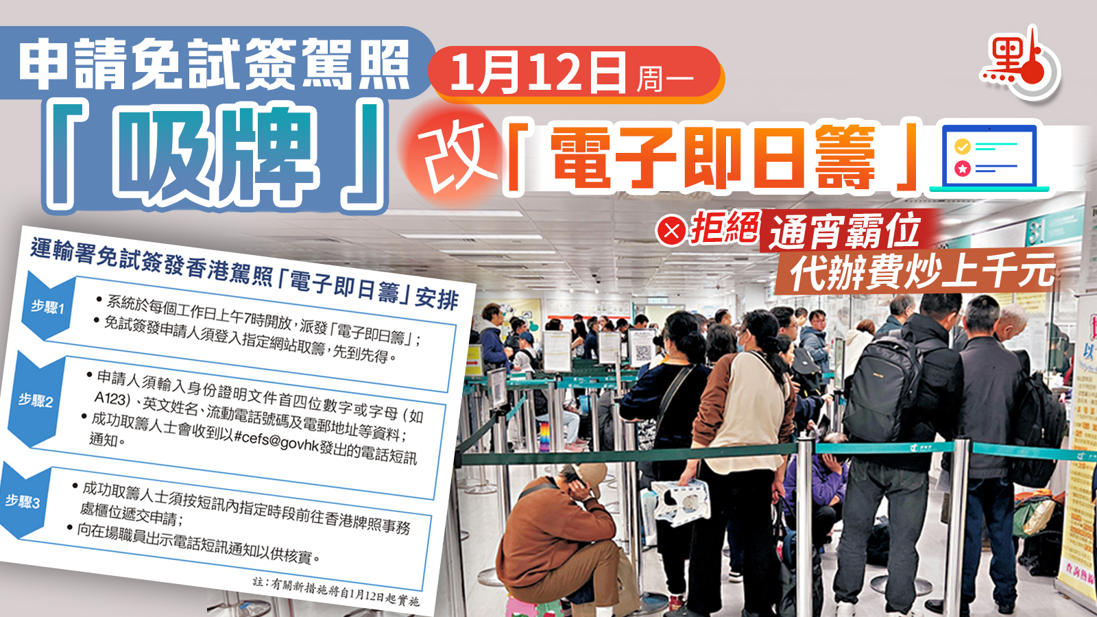 金鐘運輸署牌照事務處排隊黨亂象愈演愈烈,香港文匯報昨日(1月7日)頭版獨家調查報道《「吸牌」排隊黨肆虐 每天「招兵」斂財25萬》見報後,特區政府運輸署昨日下午迅速宣布,由下周一(12日)起,金鐘統一中心的香港牌照事務處將對申請免試簽發香港正式駕駛執照(俗稱「吸牌」)實施「電子即日籌」安排,全面取代現場派籌,以應付與日俱增的需求,並確保真正有需要的市民能公平有序地使用服務。同時,運輸署正與數字政策辦公室合作,優化現有網上預約系統,長遠而言會積極研究引入人工智能(AI)技術處理申請程序,讓服務更便捷高效。