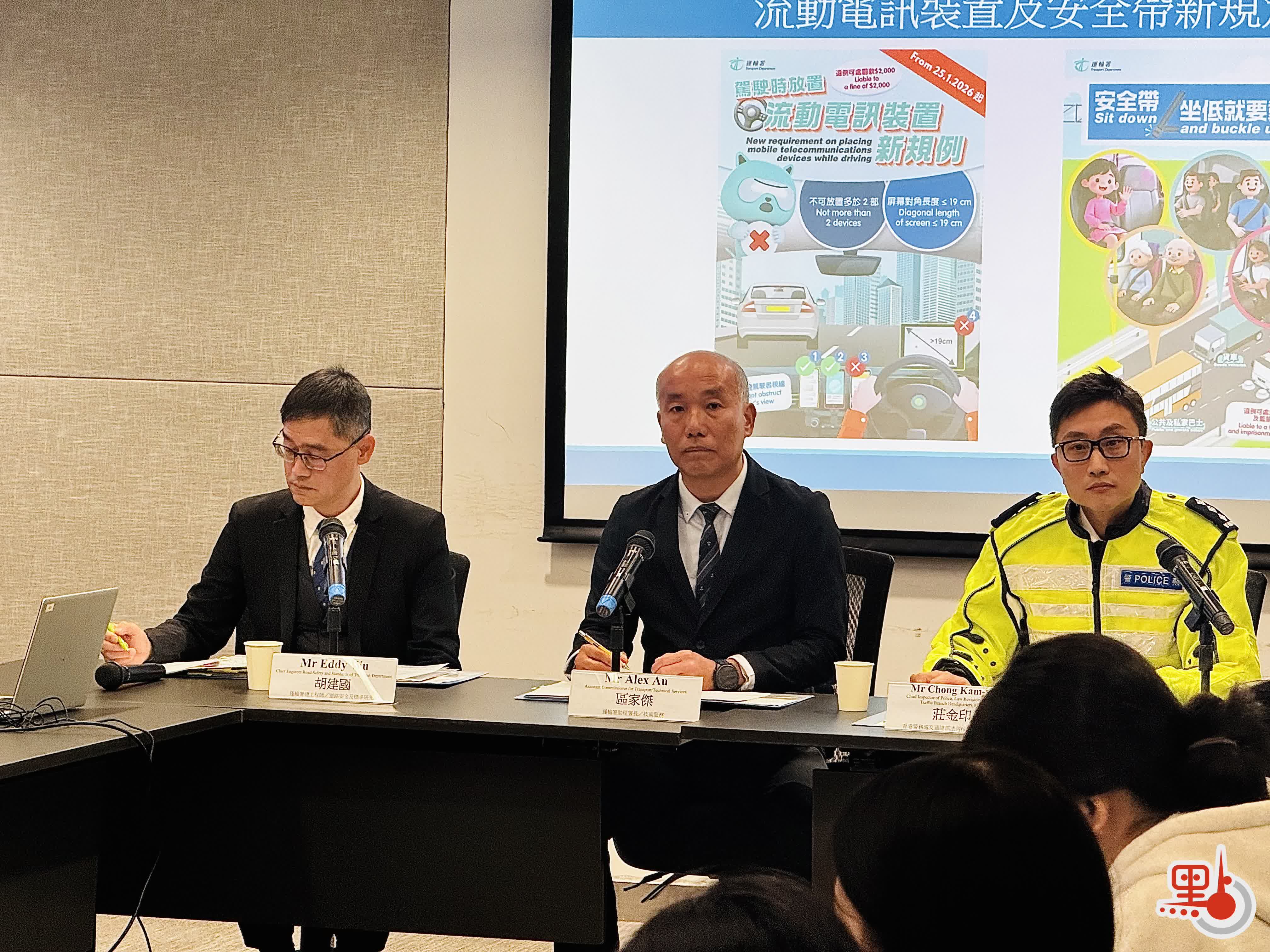【點新聞報道】運輸署今日(8日)舉行記者會公布,兩項道路安全新規例將於1月25日正式生效。新規包括所有公共交通工具和商用車的座位乘客均須佩戴安全帶,以及任何司機在駕駛時均不可使用多於兩部流動電訊裝置。兩項新規定旨在進一步加強道路、乘車和駕駛安全。