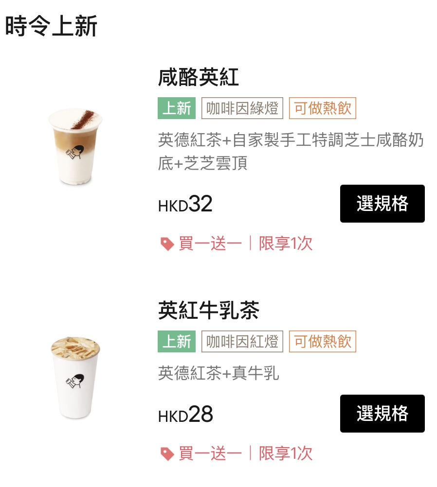 喜茶今日亦推出快閃優惠,凡於港澳地區分店購買「鹹酪英紅」、「英紅牛乳茶」兩款新品,即可享受買一送一優惠。當中,鹹酪英紅定價32港元,英紅牛乳茶定價28港元,使用買一送一優惠後,至抵14港元即可享用冬日溫熱牛乳茶~