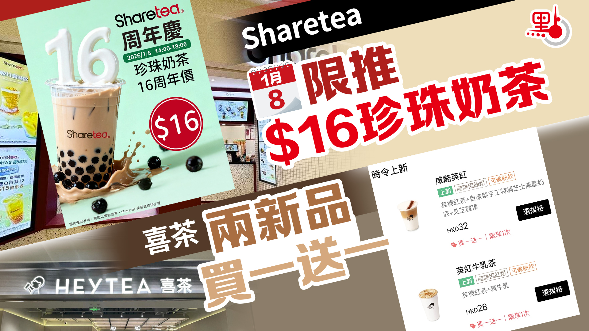 【點新聞報道】香港Sharetea及喜茶今日(8日)推出限時優惠!香港Sharetea為慶祝16歲周年慶,凡於今日下午2點至6點購買珍珠奶茶只需$16;由1月9日至31日期間購買蜜烏龍珍珠奶茶只要$20。