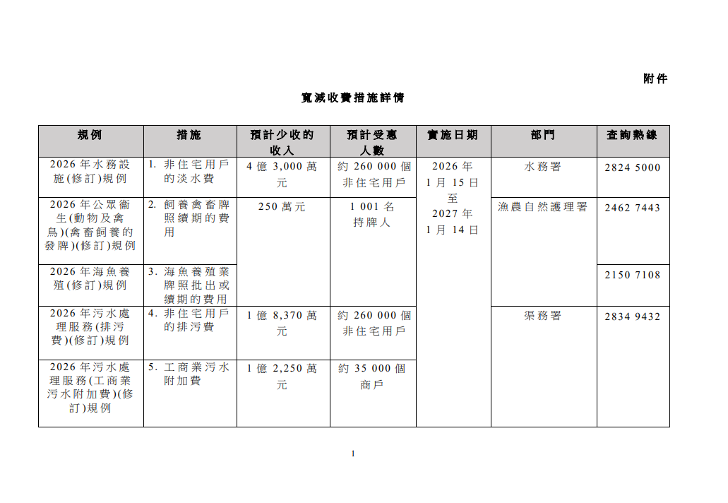 【點新聞報道】為落實行政長官在新一份施政報告公布的一系列支援中小企業的措施,政府今日(9日)在憲報刊登6項規例,以減收非住宅用戶50%的水費和排污費,每戶每月寬減額上限分別為1萬元及5千元;減收工商業污水附加費50%;以及豁免指明漁農業牌照和酒牌的首次簽發或續期的費用。
