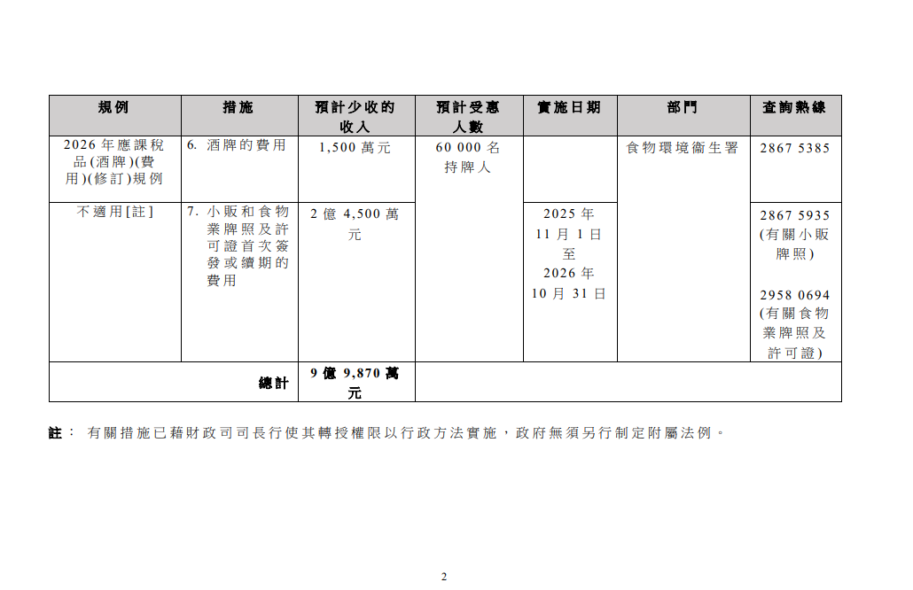 政府表示,寬減措施為期1年,將於1月15日開始實施。相關規例會於1月14日提交立法會進行先訂立後審議的程序。政府早前亦透過行政措施,豁免小販和食物業相關牌照及許可證首次簽發或續期的費用,為期1年。