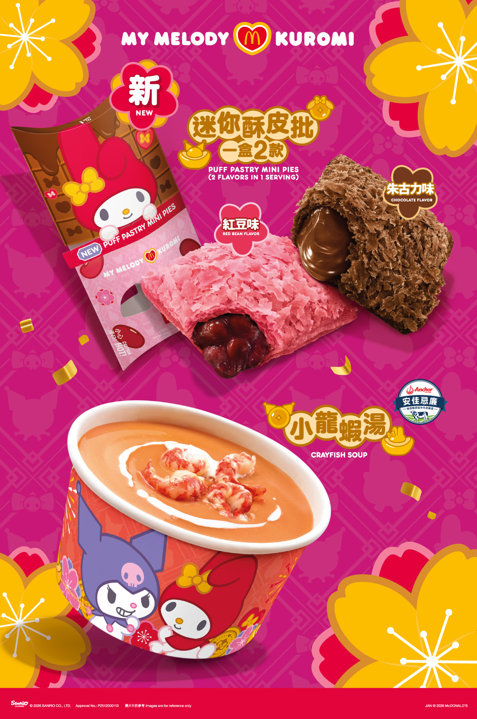 【點新聞報道】麥當勞與My Melody & Kuromi由1月9日起帶來多款新春限定滋味美食,包括新年必食招財福堡系列、開運青花椒味雞翼、小龍蝦湯、扭扭薯條、草莓乳酸味特飲,以及全新口味的迷你酥皮批,全系列新春美食均會以印有My Melody & Kuromi的包裝盛載。